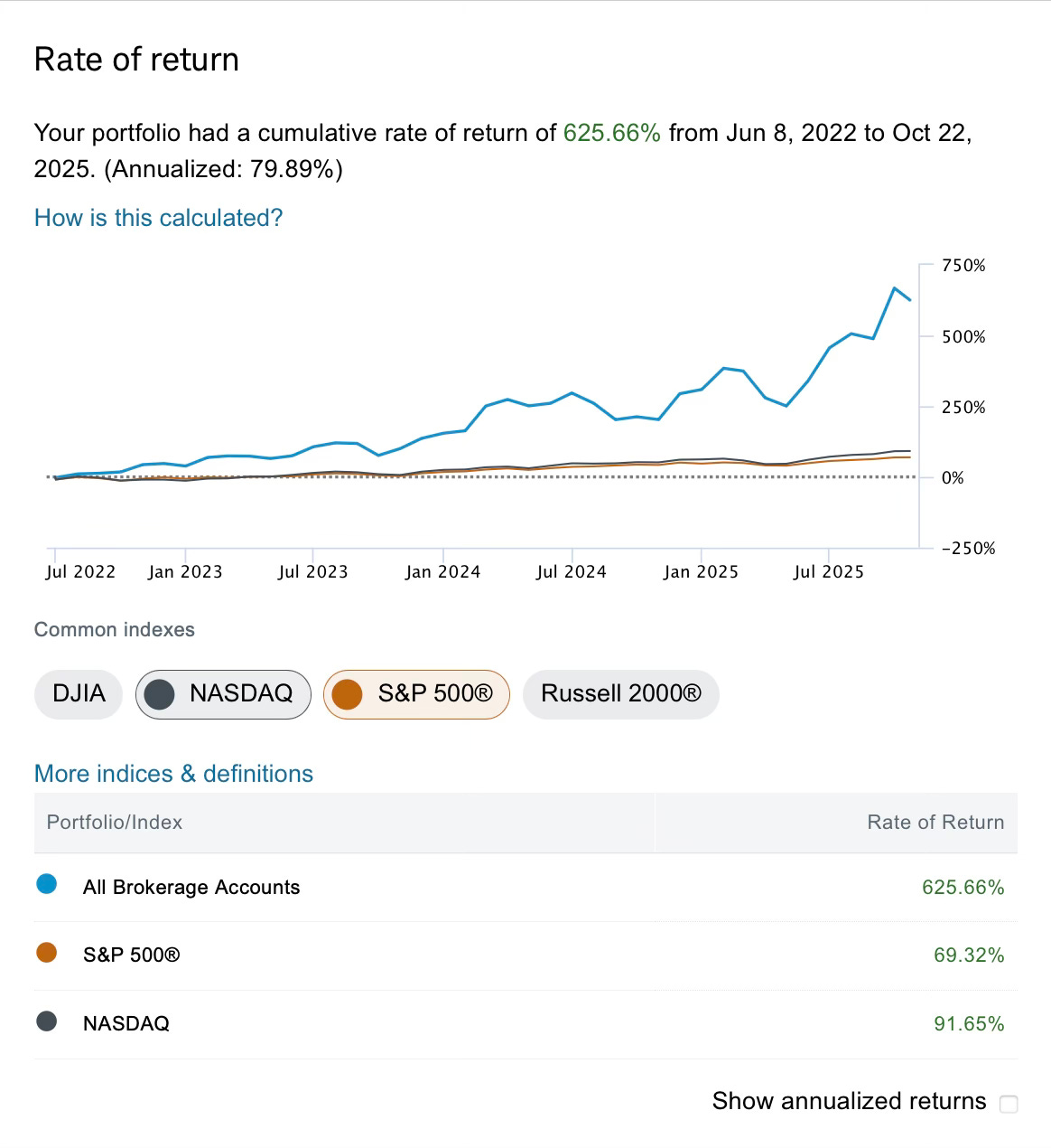 Also you should subscribe because I’m honest, while everyone else is posting their excel spreadsheet gains, I post my trades and gains straight from my book. My open book is included in every recap. When I execute a trade you can see the size in the volume on the option chain. I don’t make trades often but when I do they come with a deep insight on the how and why. Aside from that, I’ve posted all my real returns from day 1 where I’ve outperformed the market by almost 9x as of today October 23,2025 since I began writing this substack in June of 2022 as you can see below. I’m not perfect I do occasionally lose too as you can see below, but I always manage to learn from my mistakes and right the ship quickly. We went through a really rough patch when I started writing before the great 2023 we just had but I always managed to find trades that worked utilizing my own method of digging through the options data to find the trending names that I share with you all daily.