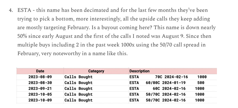 Odd session today, I don’t think I’ve ever noted so few puts bought. I’m not sure if that means anything or just a one off. One that stood out to me today was ESTA, I highlighted it 1 week ago on Monday after all the odd action came in, it was up 10% at the open and has given a little back now. I’m not sure what news they got today, but not shockingly, the call buyers came beforehand.