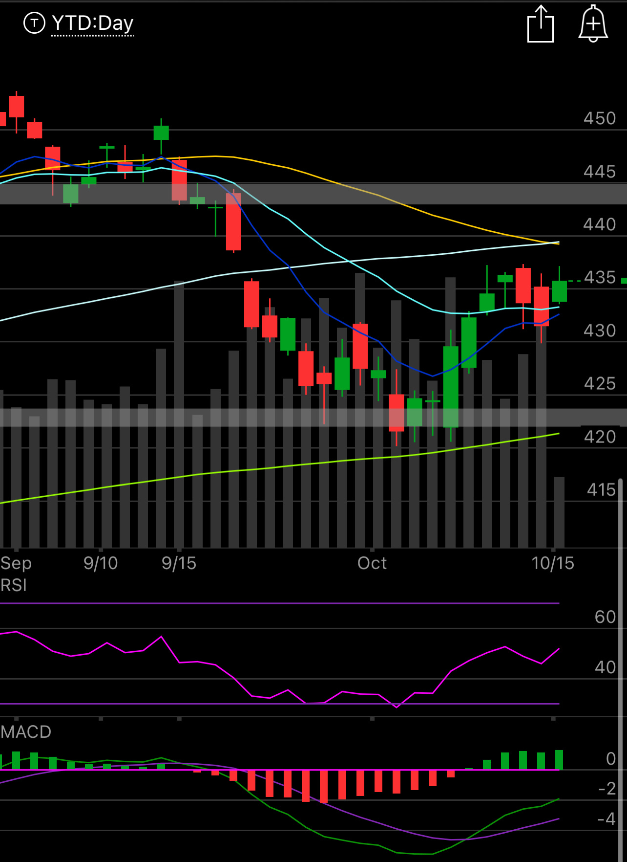 The SPY is flagging here for the last 5 sessions over the 8 ema, nothing bearish about that, over 440 it can really make a strong move higher. It really is all going to come down to earnings and this week we only have 1 of the big 7 reporting in Tesla. So this week is probably nothing material until we get into the rest of the big names reports next week.