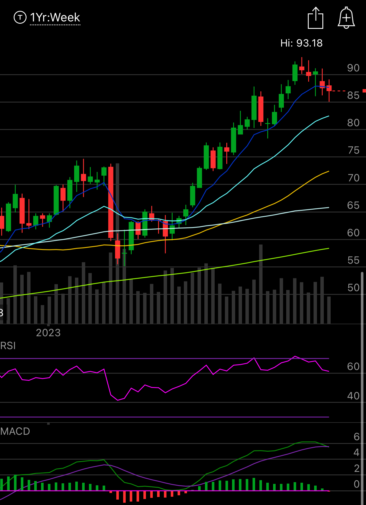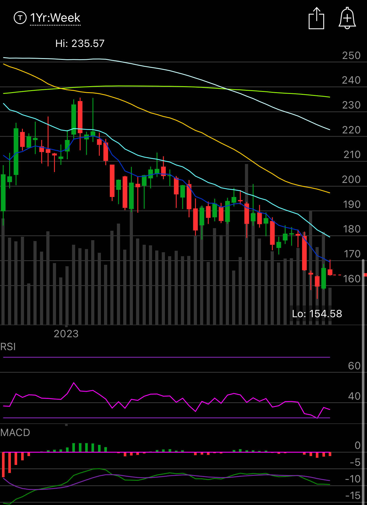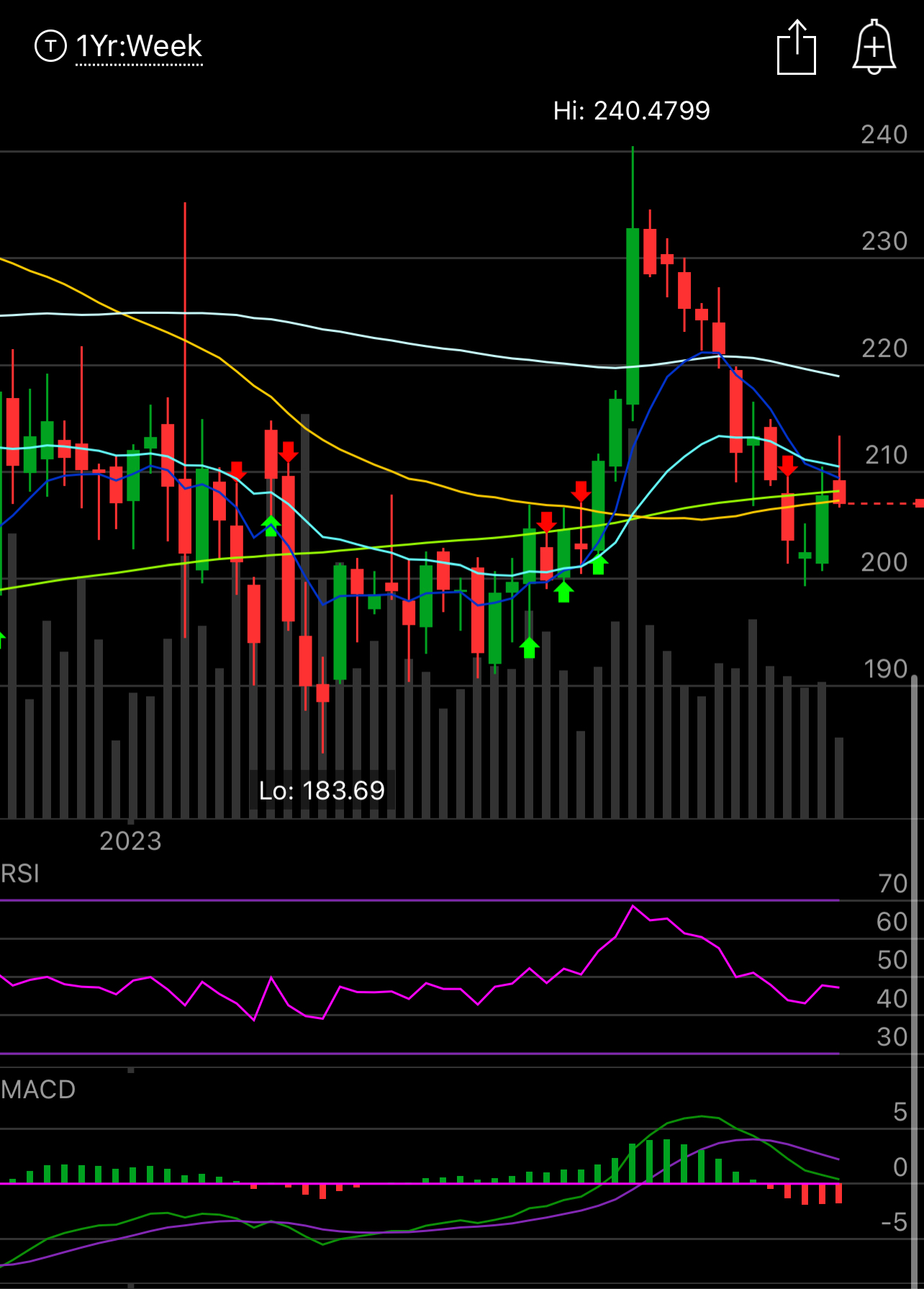 AMT - I wrote this one up a couple weeks back and today it saw a very interesting trade selling deep in the money puts at 175 and buying that same strike 175 calls in November. These can payoff nicely with just even a small move up in the next month. It rejected the 8 weekly ema again this week. I still like put sales lower as this is a very good name to have in your portfolio.