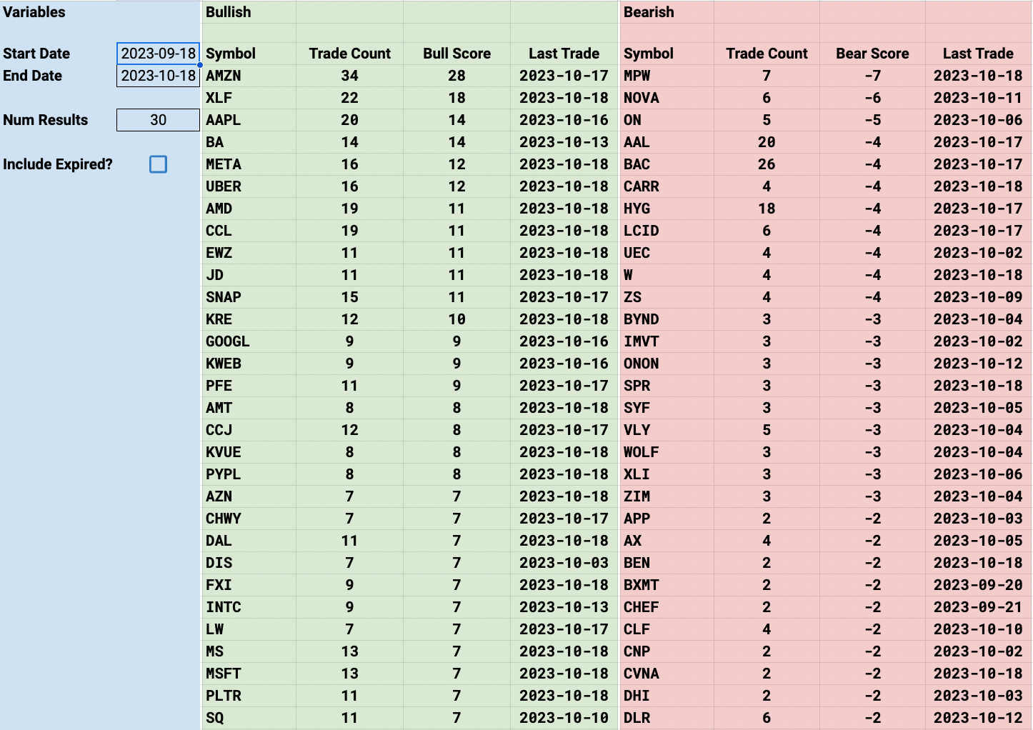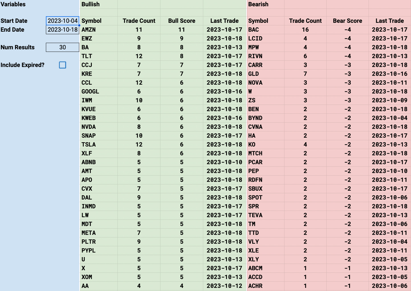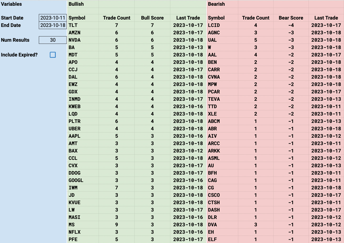 The TLT has overtaken the top spot in the short term trends. It has a very nice double bottom setup, that makes sense. Lots of smaller names like INMD,MASI, and U are showing up in the last 2 weeks as bullish.