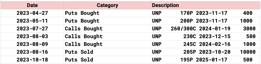 UNP - Union Pacific had an incredible earnings reaction last quarter and just sold off all quarter long, that doesn’t happen often. Today someone sold 500 puts at 195 for January 2025 which would put them in below 190 and looking at the chart below, that would be below support. I like that trade alot. Rail is the most efficient method of transportation and will always have a place in our economy.