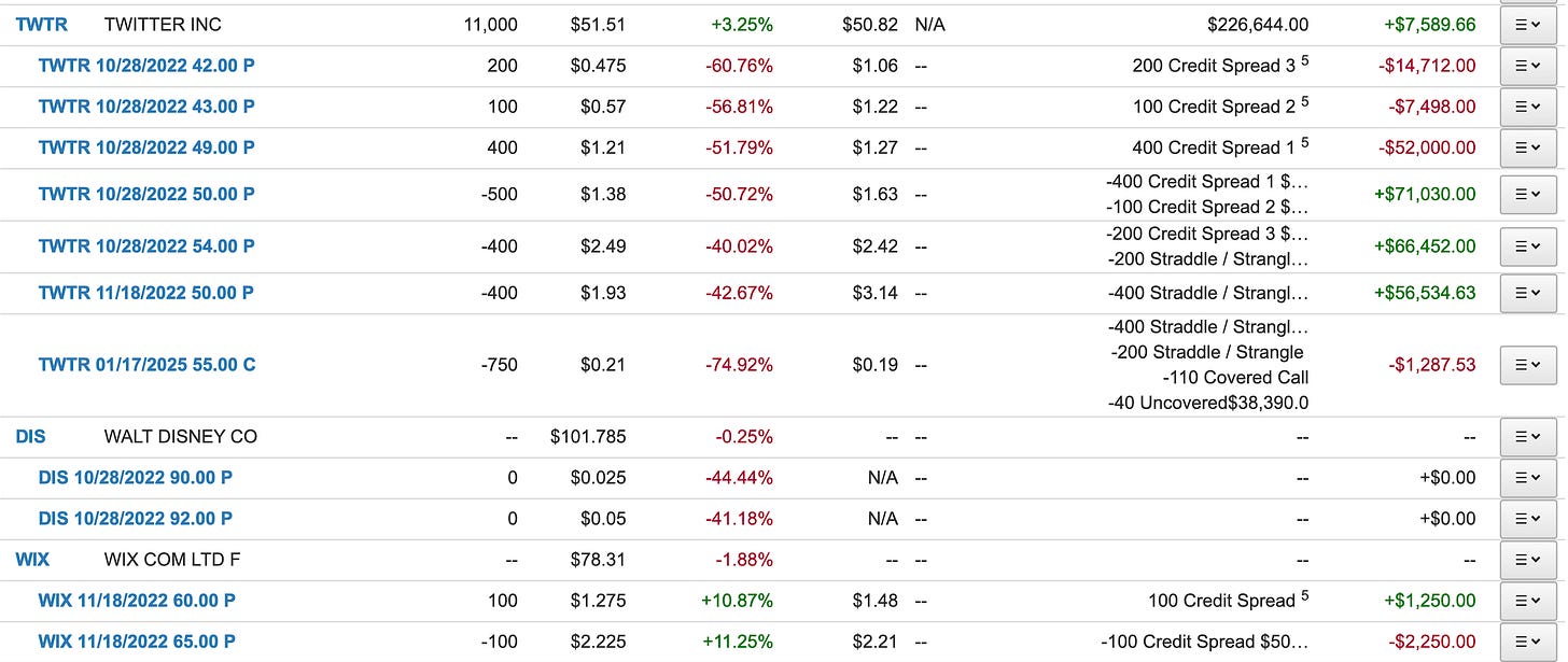 Really well actually, I got back most of what I lost friday on that fake report. I mentioned Friday that I didn’t believe what was going on with Twitter as material and so far that turned out to be true. Almost criminal what those 2 reporters from Bloomberg did. I actually went all in this morning premarket adding more shares, I even closed out other positions I had so I could buy more once I saw the huge volume Tesla put in the first 2 hours. To me, that was likely Elon Musk selling and we will see a Form 4 soon. This deal is winding to a finish, likely by friday the 28th, the deadline. So for me personally, not much to trade this week, just going to let this final week play out. I sold some Jan 2025 55 calls against my positions today, the deal is at 54.20, these should expire worthless when the transaction executes. The only reason they have a bid is because he could not pay, we go to court and Twitter gets more with interest. I do not see that as a likely scenario at this point. The banks have all announced their financing plans.