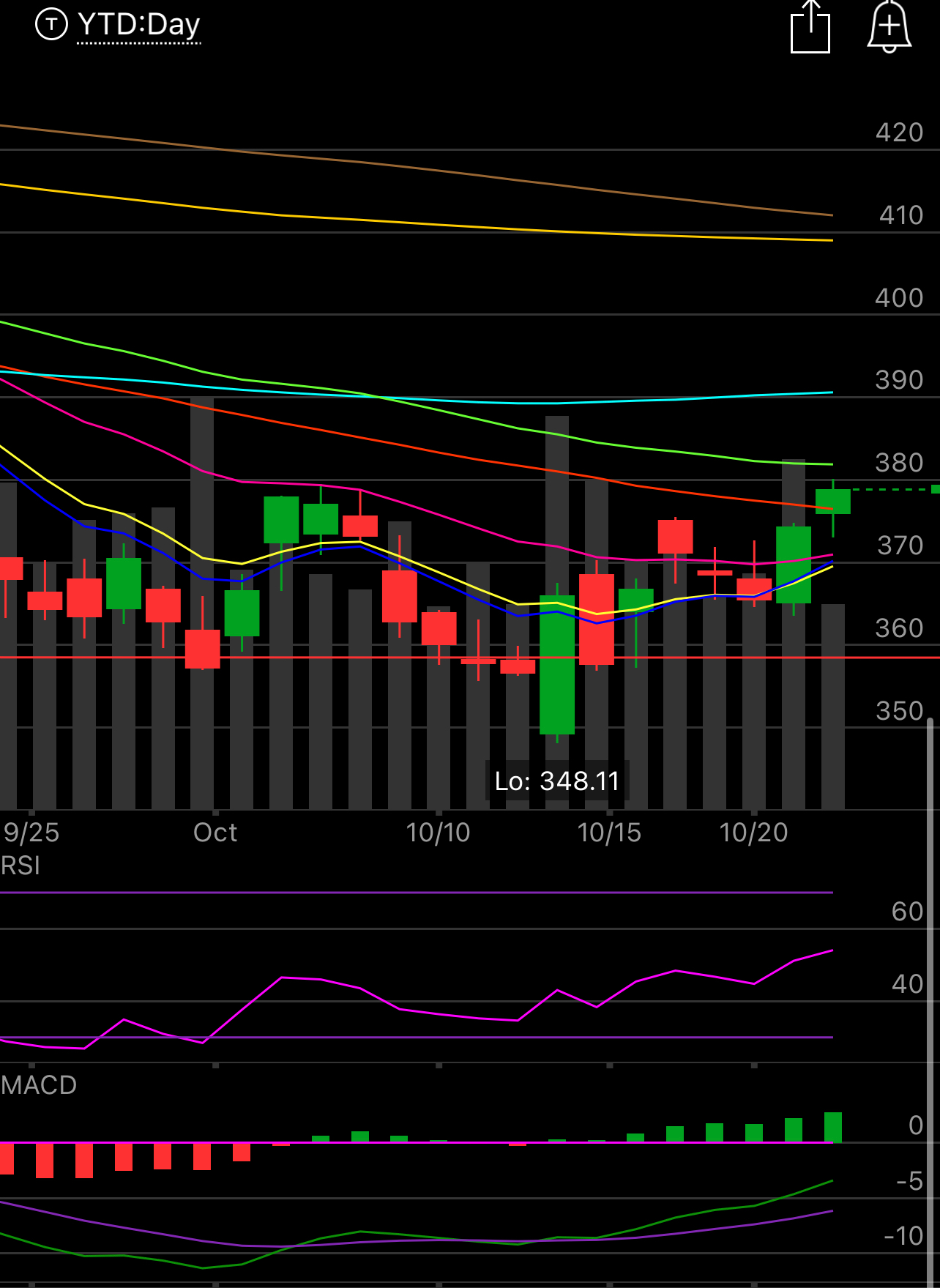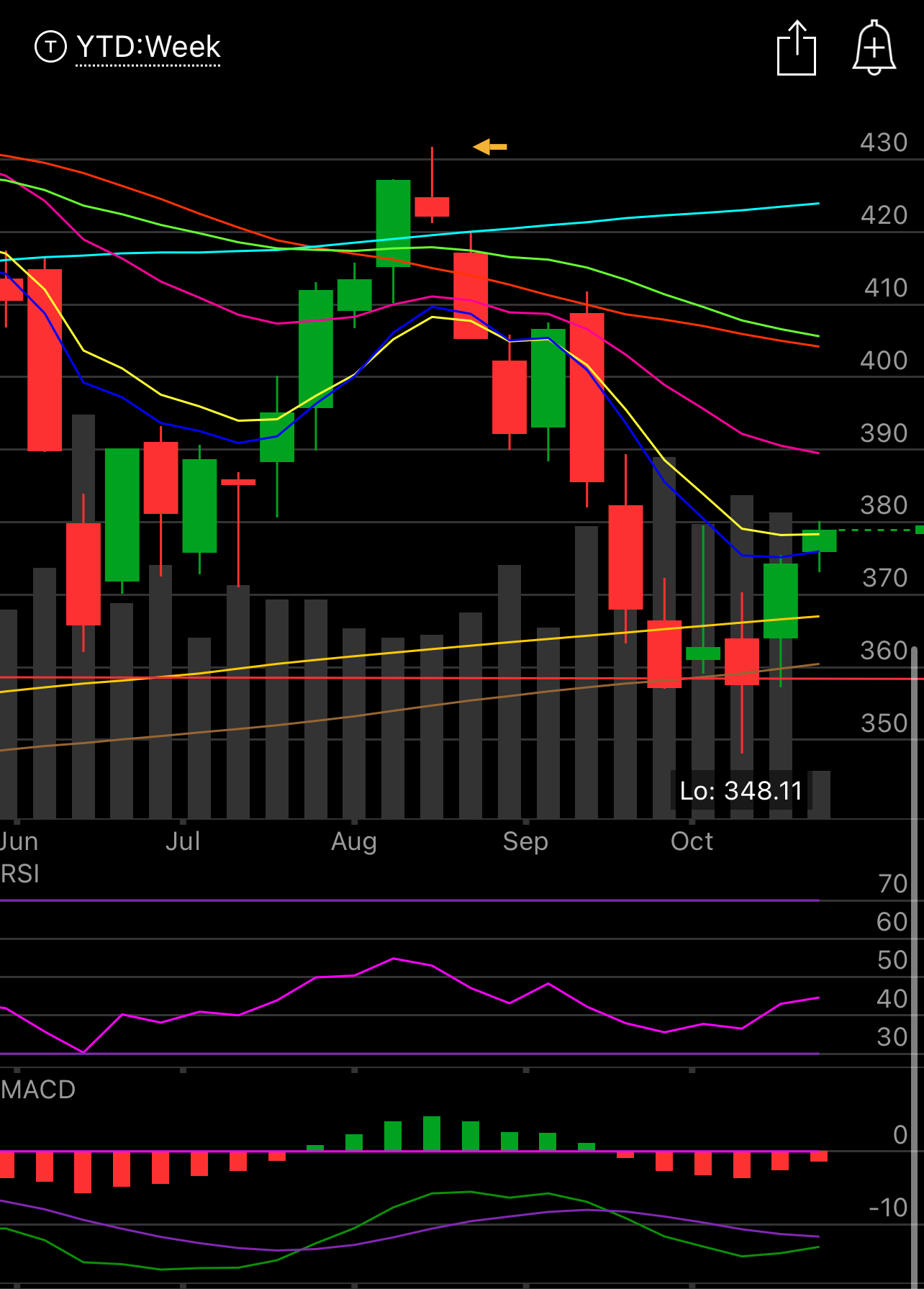 Here on the weekly, while I do like the bullish divergences I’m seeing, it’s too early to tell because so much of the market is reporting this week, how those go will tell us alot. What if that candle ends up lower forming a bearish engulfing? What if we end up at 400? I don’t know, I just let the candles form and I decide what story the market wants me to see after. That is why I will remain in Twitter for the rest of this final week and then see what the candles have in store for me after.