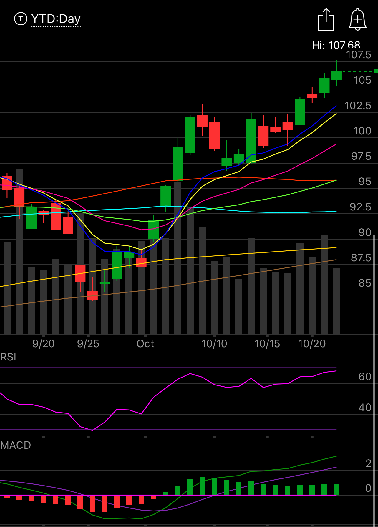 XOM was green today, the 98 puts I suggested selling over the weekend should still be a nice trade even with earnings this week, this chart is a thing of beauty and it continues to rise above all the key averages.