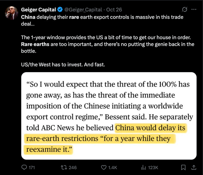 I can’t really take this “deal” seriously because it is like all the other times we’ve claimed a breakthrough with China and it was really nothing. China has made it pretty clear they’re not going to give in to our actual demands and we make these surface level deals that Don can claim as big wins to the masses. I would say this tweet sums up the whole deal yesterday and I’ll discuss it more in my positioning below. China processes over 90% of the rare earths, for obvious reasons like environmental concerns, we don’t want to do that here, so we are in a pickle where we need these rare earths badly and don’t actually want it done here so we’re just heavily reliant on China and they know that and that is why they never really give in. We’re crushing them on exports with tariffs and they’re holding rare earths over our head. We are not on good terms no matter how it appears. China is trying to replace our consumer demand and we’re trying to replace their rare earths as fast as possible.