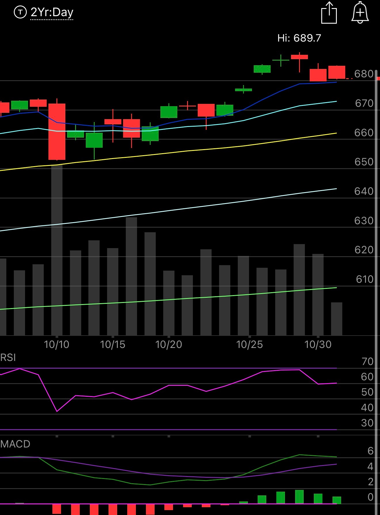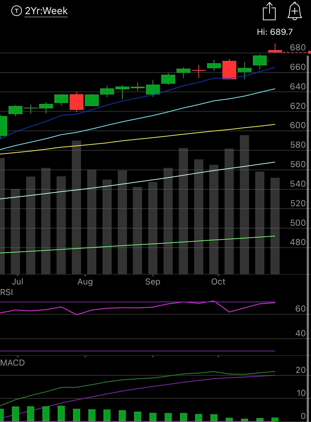 The VIX today is sending a bit of a warning signal with its action in this green tape so that is the 1 thing I’d say is a slight concern to me right now and the weekly chart is putting in a terrible candle right now. This is a gravestone candle if we close here, you can take a guess on why it is called that. Let’s see how we close today before discussing that though but we are very extended, nearly 10% away from the 21 week. I’d say its definitely time to be cautious now, we got the megacap reports, they were strong but the reaction isn’t exactly the most bullish at the moment.