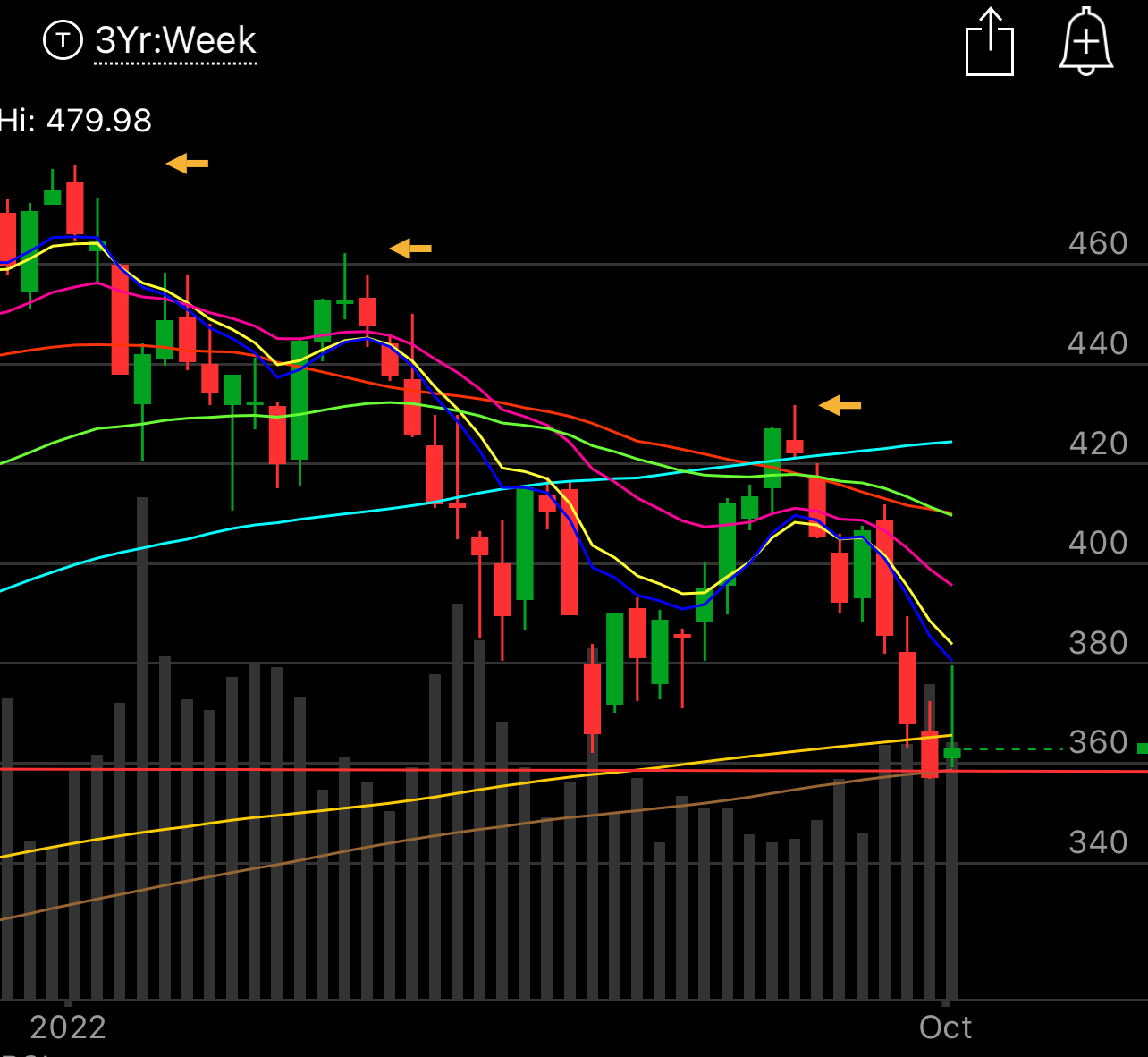 I’m all cash now after having Twitter called away last week. I will be re-entering tomorrow with short puts. Look at the first few charts I posted, this is either a market bottom here or we’re going into the abyss. I still stand by my previous calls for 3300 on the SPX and in a worst case scenario 2800. Rates will stay higher longer, multiples will compress, and the last time we had a 3.75% FFR the multiple was 13. For the moment analysts are at $235 of earnings(I don’t see it) and if they’re right, but we get a 13 multiple we’re at 3,055. We are currently at 3,650. So if multiples do compress to historical norms, we’re much lower. That’s all a moot point, in here, I trade what I see that is all. Week to Week is my focus and for the next 3 weeks, until this Twitter saga is over, the risk/reward of playing that vs the market is a no brainer. The market will not outperform it in that timeframe, not a chance, so it will continue to be the focus of my attention.