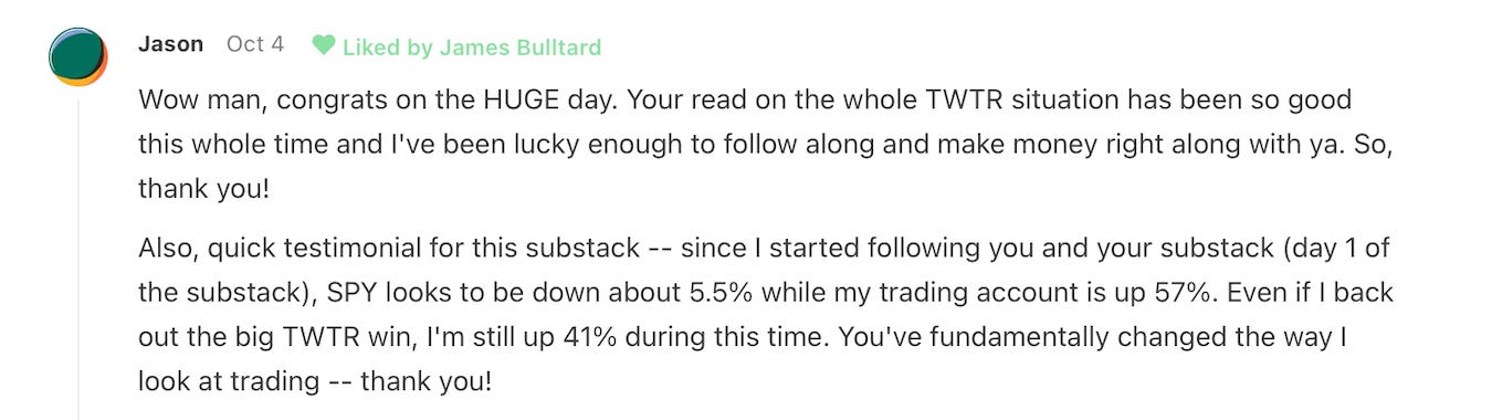 Last week was a whirlwind, I’ve never made that much money for myself in 1 day before. Those who have been here long enough know how incredibly long Twitter I have been for the last 6 or 7 weeks. I never really thought Elon Musk had a shot at getting out of the deal but in the back of my head, knowing him, I always worried something bad was going to happen. It left me in a spot where I really did want to take some time off and just not even want to mess with this chaotic market for a few weeks/months and just enjoy some time off. Then I started reading the emails you all send me followed by the comments on my last few posts and I felt like I’d be letting some of you down by taking break so here I am. This is what I mean