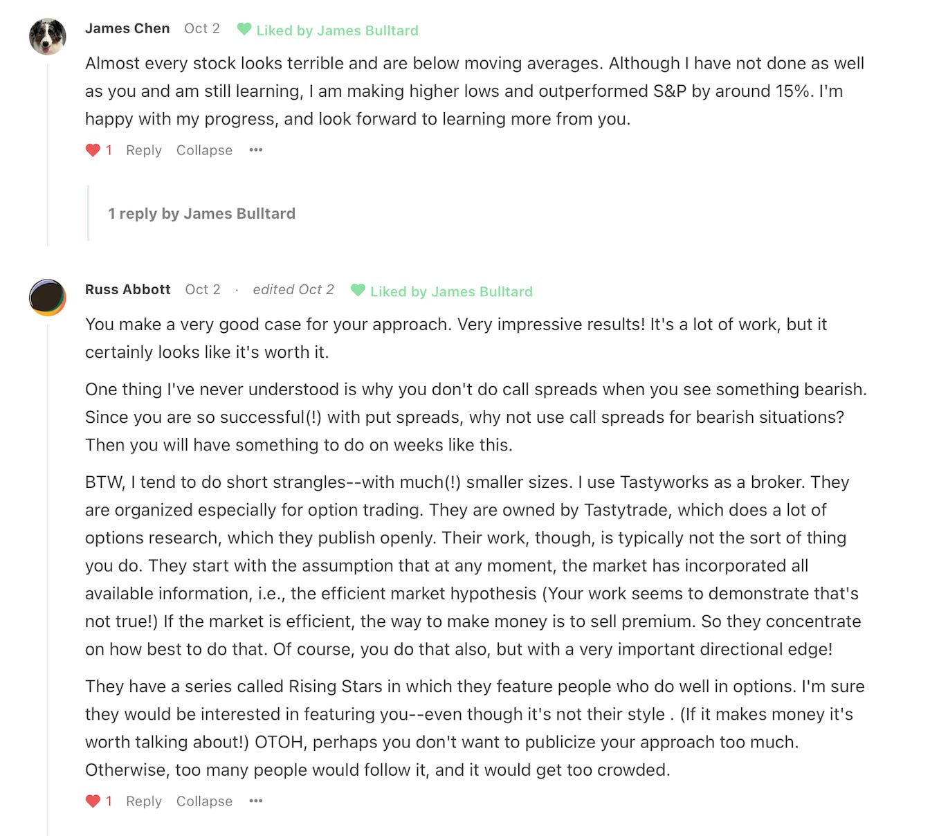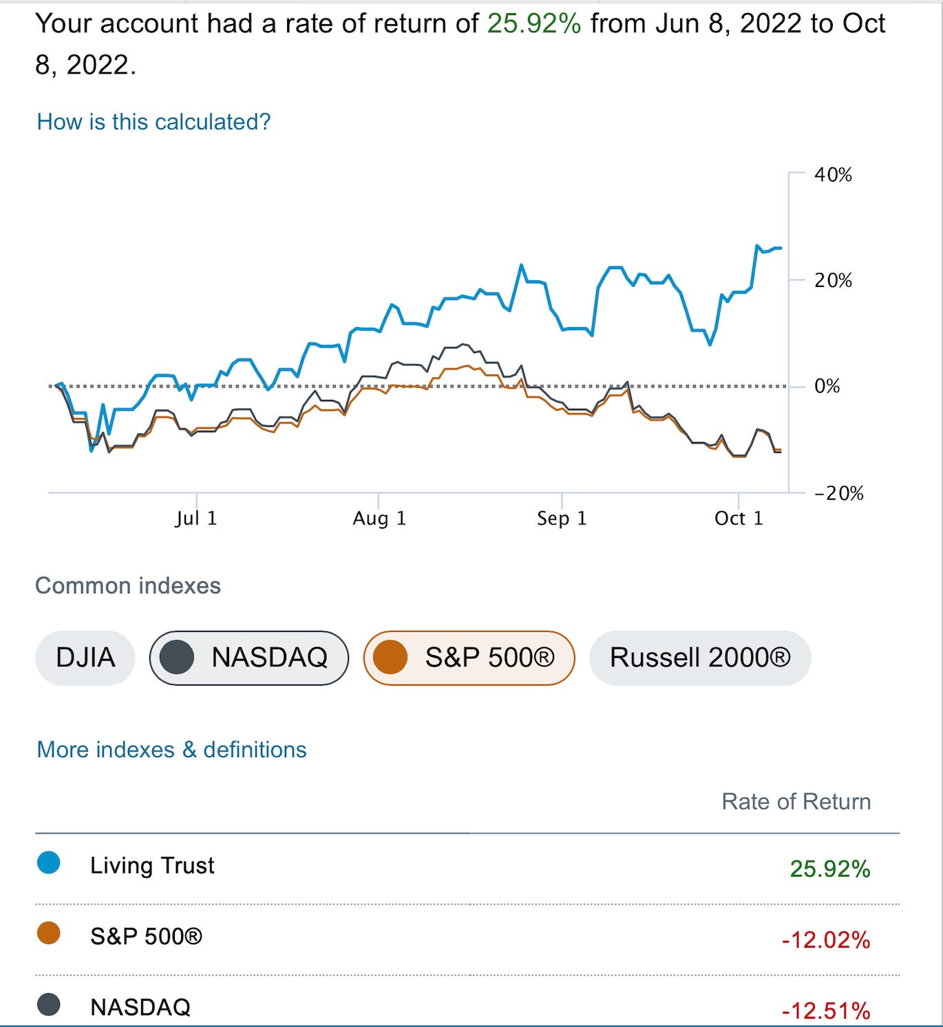 Overall as month 4 wrapped up this week, the divergence widened even more and I’ve returned 25.92% while the S&P is down 12.02%. You can see below even before I got into Twitter in late August I still had a wide gap vs the market, and while many of my other positions I’ve had to take losses on recently, Twitter did what I thought it would do which was protect me into what I thought was a weakening tape. It did it’s role perfectly.
