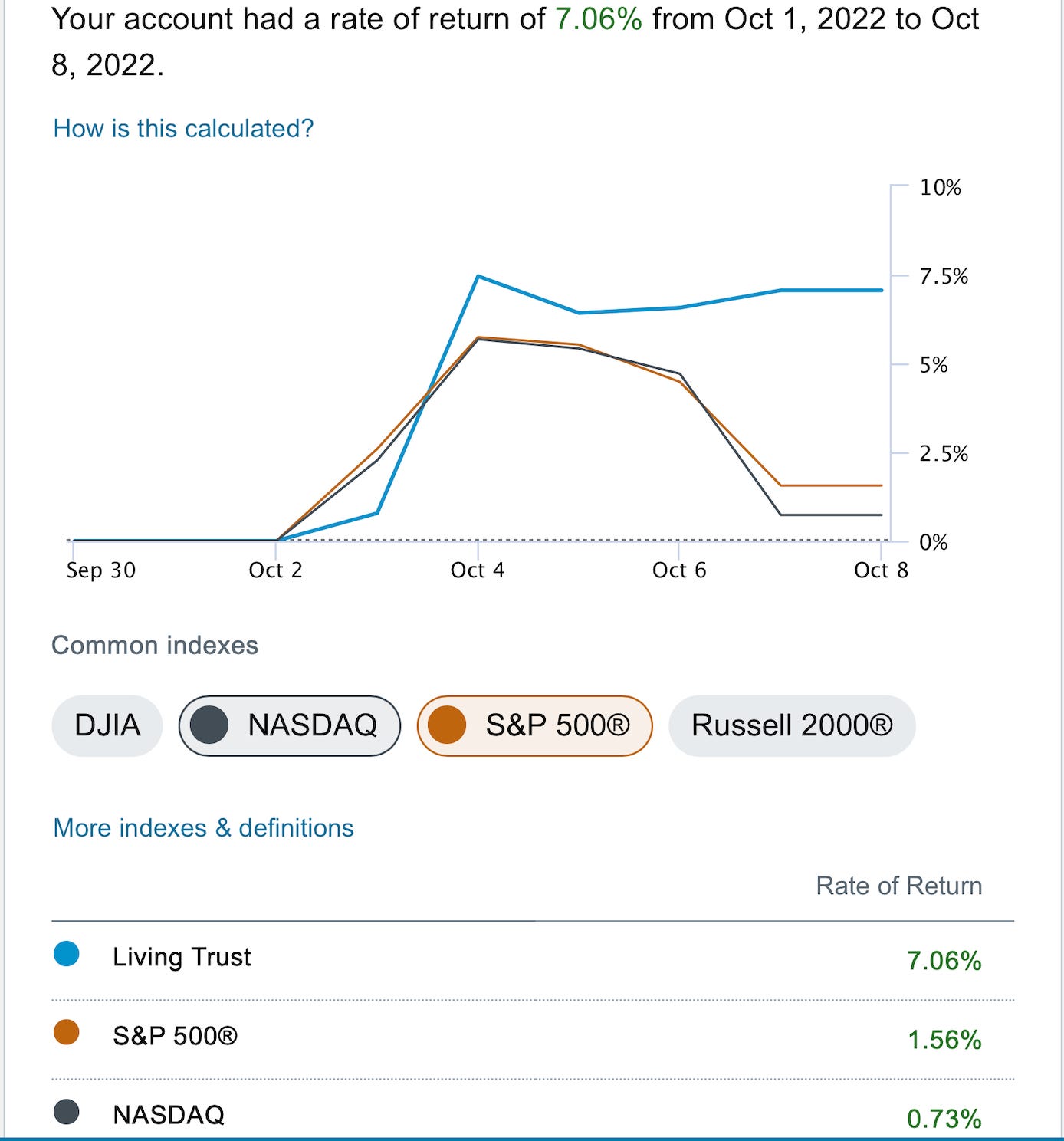 Last week I only returned 7.06% in my trading account because I got conservative with my covered calls on Twitter. I wasn’t expecting the takeover to see the news it saw before the trial. Elon was fighting tooth and nail then just folded out of nowhere. Although I was mad I missed so much upside, it was another week where I outperformed both the S&P and Nasdaq by alot.