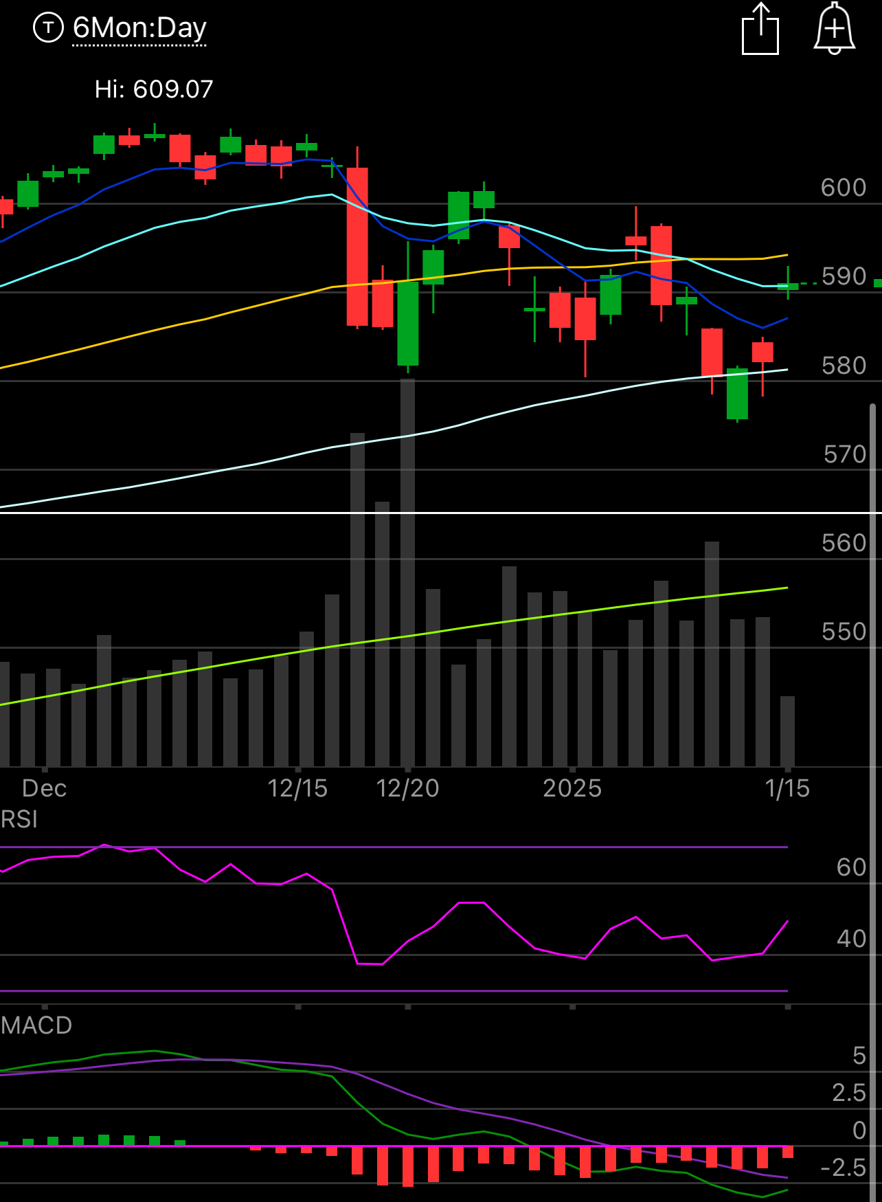The SPY opened up right at the 21 ema after that cool CPI report today. While everyone is excited I would say be patient, see where we close today, look at the chart below, it has been a series of lower highs going back a few weeks, that isn’t exactly bullish. We would need to see a break of that trend and now the only resistance left in our way is that 50 day, the yellow line, above. We are flat on the year as chaotic as it has been, but bank earnings were fine this morning, now we all await the megacaps reporting soon. We have had 2 breaks below the 100 day in the last 2 sessions and both reclaimed it before the close. So nothing to get too bearish over, but at the same time nothing too bullish, we’re just stuck in this web of moving averages for now, no decisive break in either direction.