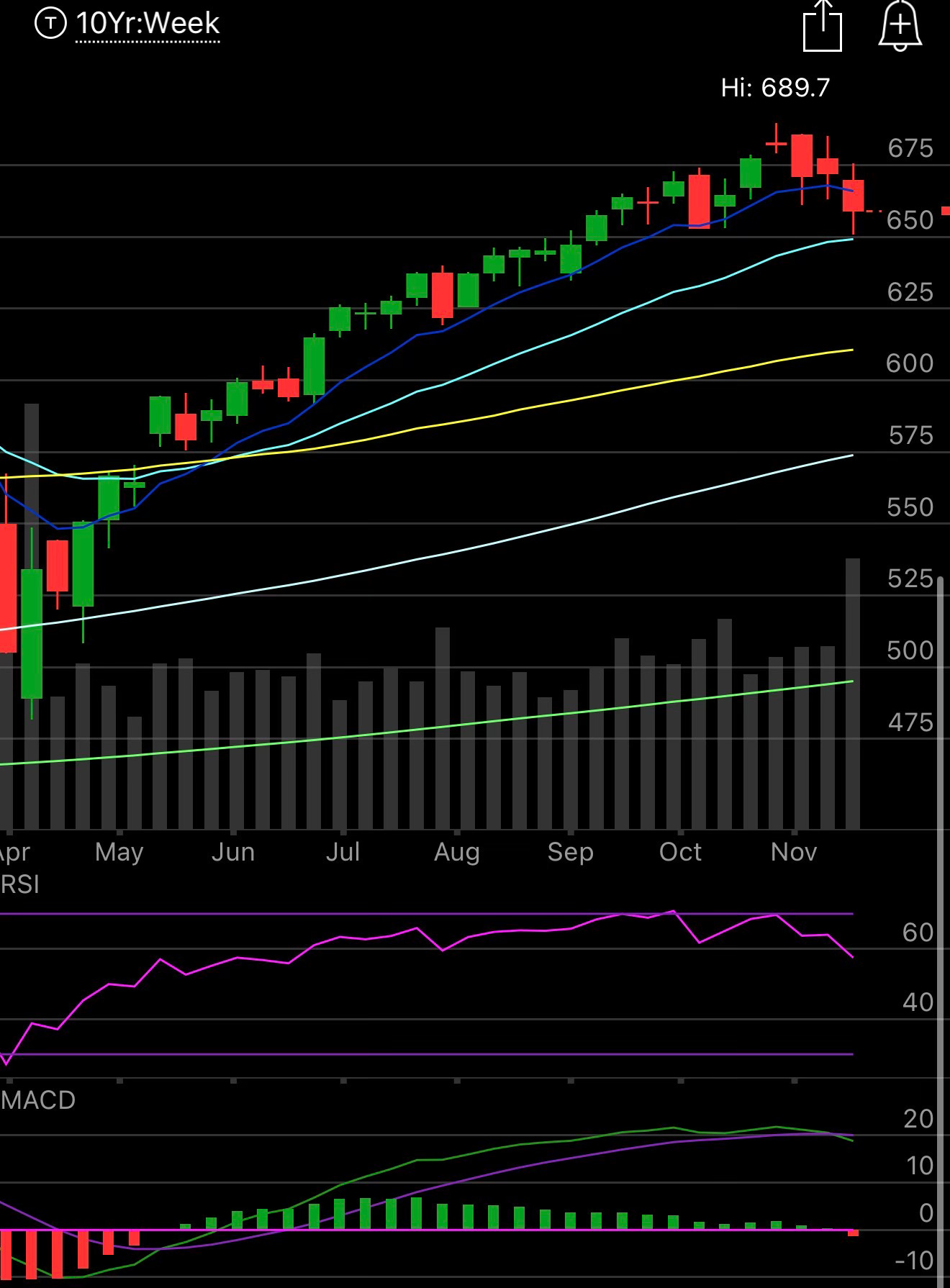 So what do you do here? Well for starters you can take the megacaps like Amazon and Microsoft long at the 200 day and risk a few dollars on a close below it looking for a bounce, both had great quarters, they shouldn’t be down where they are. Meta had a bad quarter, their move down was justified because of the capex. I added Amazon late in the session friday knowing that $2-3 lower was the 200 day and I could close below it if this is the big selloff. Otherwise all the normal defensive sectors are working XLV,XLP and even the XLE is still looking great on a weekly basis.We’re on week 4 of this move down this coming week is a short one with Thanksgiving Thursday and a half day friday. We have not had 5 straight red weekly candles since 2022 so let us see what this week ahead has in store but momentum has flipped negative now too.