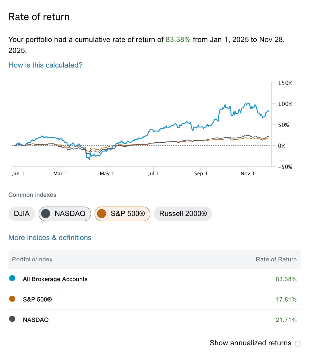So it has been a great 3 years for me. Going forward you won’t see me being as aggressive. Why? You only have to get rich once in life. This was just a trading book when this all started in 2022, it was money I had separate from my home, long term investments, etc and my goal was to be aggressive, utilize leverage where I say fit and be in the right names showing up in the data. I did a good job I think, I made some mistakes along the way but I’m thrilled with where I am. Obviously I will have to take out some money for taxes in the coming months but going forward you’ll see me trading with far less leverage. That was just something I did late this year because my capital gain was so large I was ok with losing some if things didn’t go right. Now I will likely directionally follow trending names with put sales, covered calls, etc and just focus on a more on trading with far less risk. Risk is fine in an uptrend, and we all have to take risks to get ahead in life, I just feel with where I am now with this book, my long term investments, etc that I don’t need to be full bore with the risk going forward.