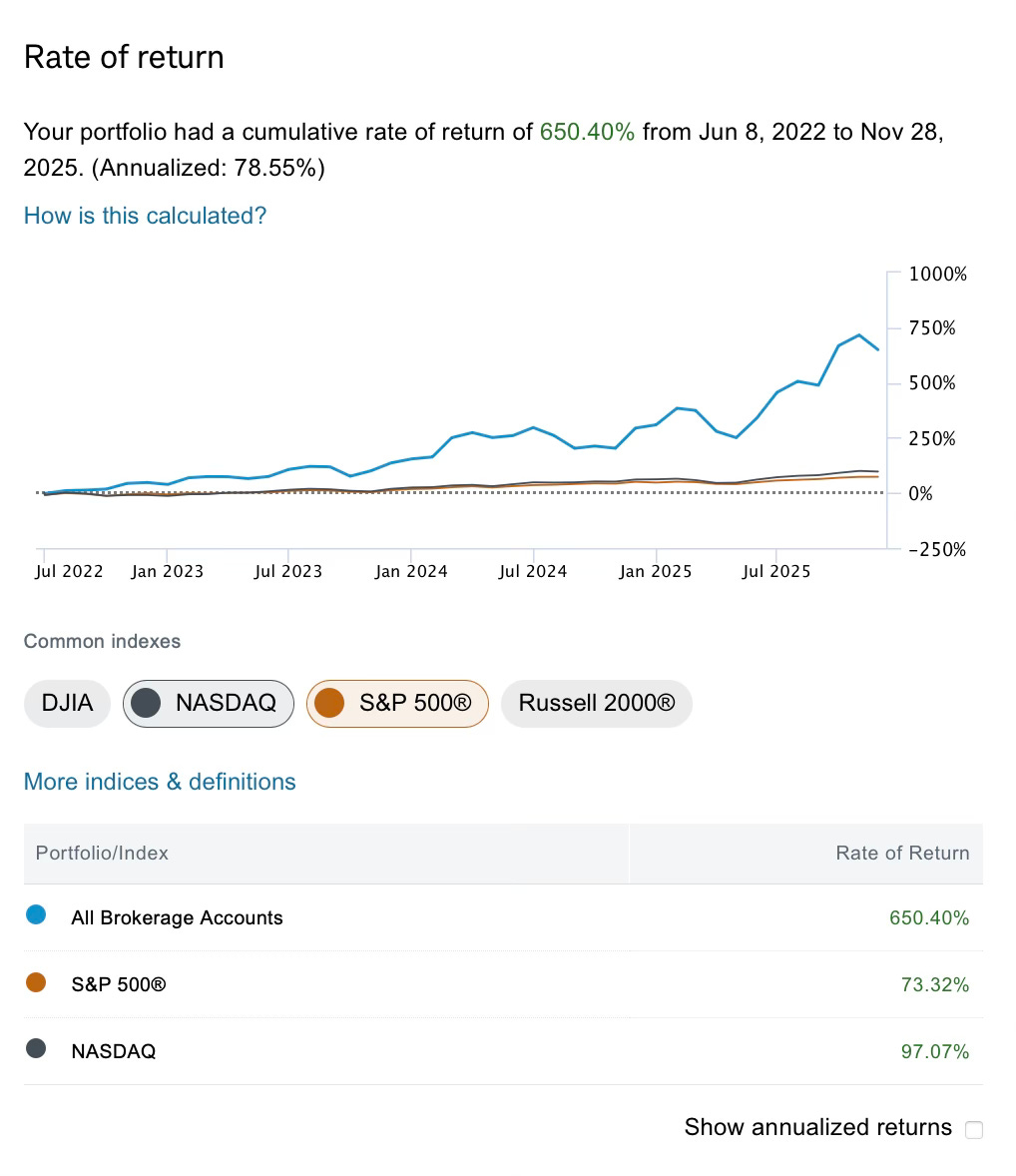 On a longer term basis I am up 650% from when I began writing this substack back on June 8, 2022. The Nasdaq is up 97% and the SPY Is up 73%.