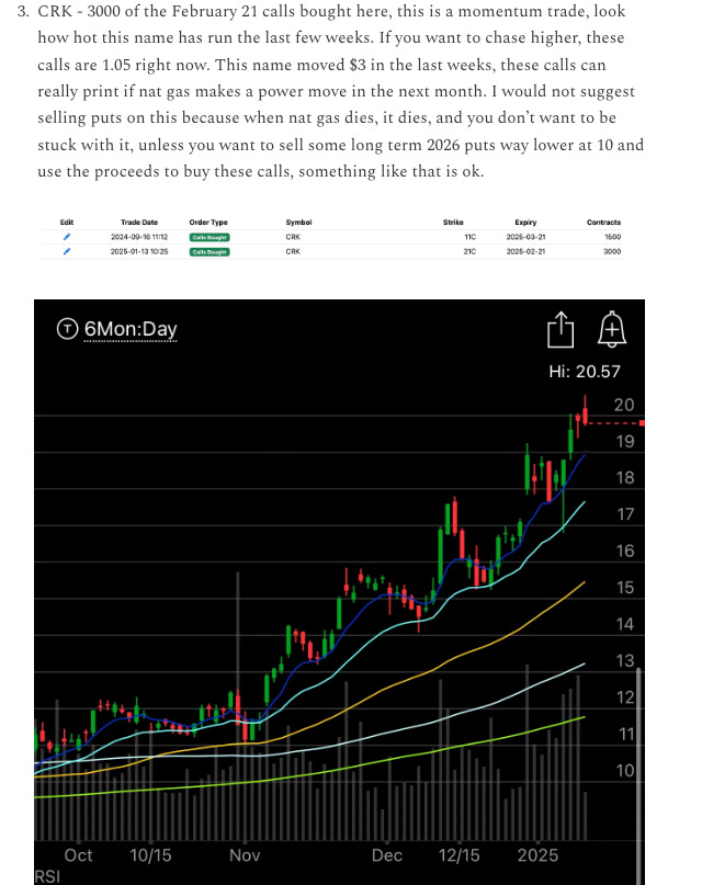CRK - In yesterday’s recap I highlighted CRK and it instantly took off rising 3% today taking those February calls in yesterday’s recap from 1.05 to a high today of 1.45. This was a quick move up and for a nat gas name, that’s a sharp move. These names don’t usually move like tech stocks but they are doing so right now, look at LNG up 3.5% too. Right now this is the sector that is working and you have to focus on it.