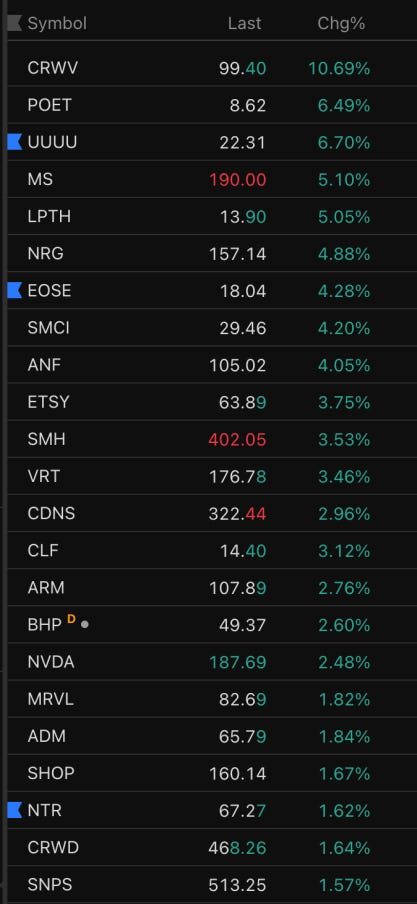 The SPY gapped up overnight with the big report from Taiwan Semi. Yesterday we broke below the 21 ema and recovered closing right below the 8 before today’s move. There really isn’t much here until we get the Supreme Court tariff ruling and kickoff earnings season. In the meantime another potential breakdown was bought right where it should have been. Semis continue to the space to be with the SMH hitting new highs this morning while oil completely reversed going down 5% after Trump decided to not strike Iran.