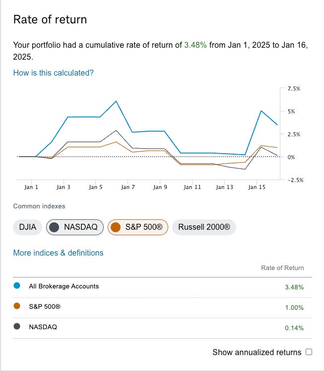 Alot of you email me asking me what I’m doing with my book, and I’ll answer this here 1 time because I really don’t want to discuss my holdings, I post them to be honest with you but it is just too many trades to discuss. I have my 1 massive AMZN call spread the 170/250 call spread I bought last year, it is up huge, but it is at $45 today and it maxes out at $80 over $250 by June 2026. So I don’t need much for this trade to gain another near 100% just 12% or so on AMZN in 18 months, nothing crazy. The rest of my book I am lining up short puts using leverage at levels I think would be great buys. Most won’t get assigned, very few will, if any. I’m trying to keep raising the cash levels of my portfolio with fairly conservative trades on margin while I await AMZN. So far it is working as planned, not counting today, because Schwab doesn’t update in real time, 3 weeks into the year, the Nasdaq is up .14%, the SPY is up 1% and I’m up 3.5%. The leverage is doing its thing as we’re mostly flat and the short puts are eroding slowly. As I’ve said before, I would not try to copy what I’m doing because I have a very good cushion to fall back on where my AMZN leaps are at a long term capital gain now and I can trim them if need be to free up even more cash. I’m in a unique spot with my book now.