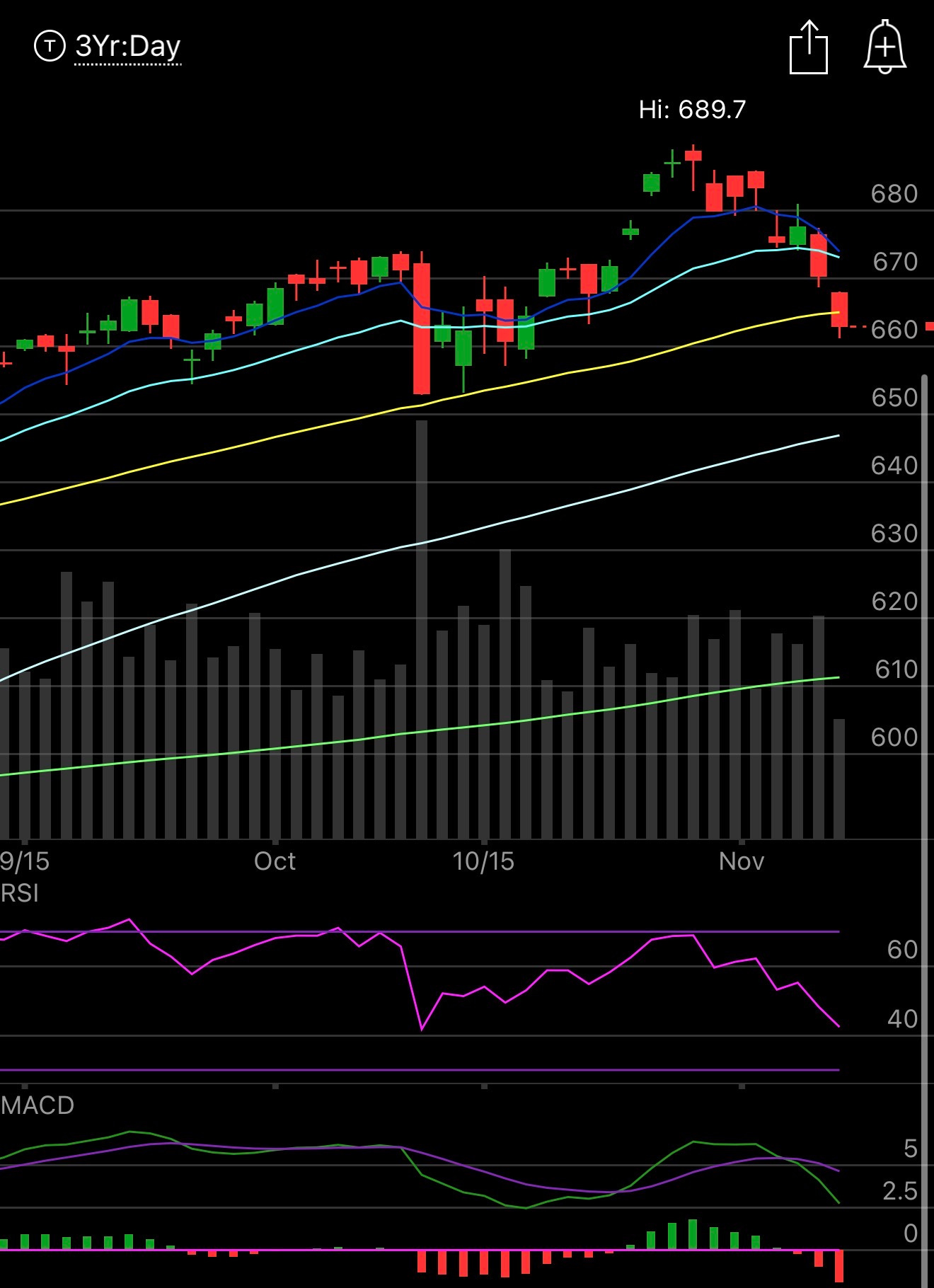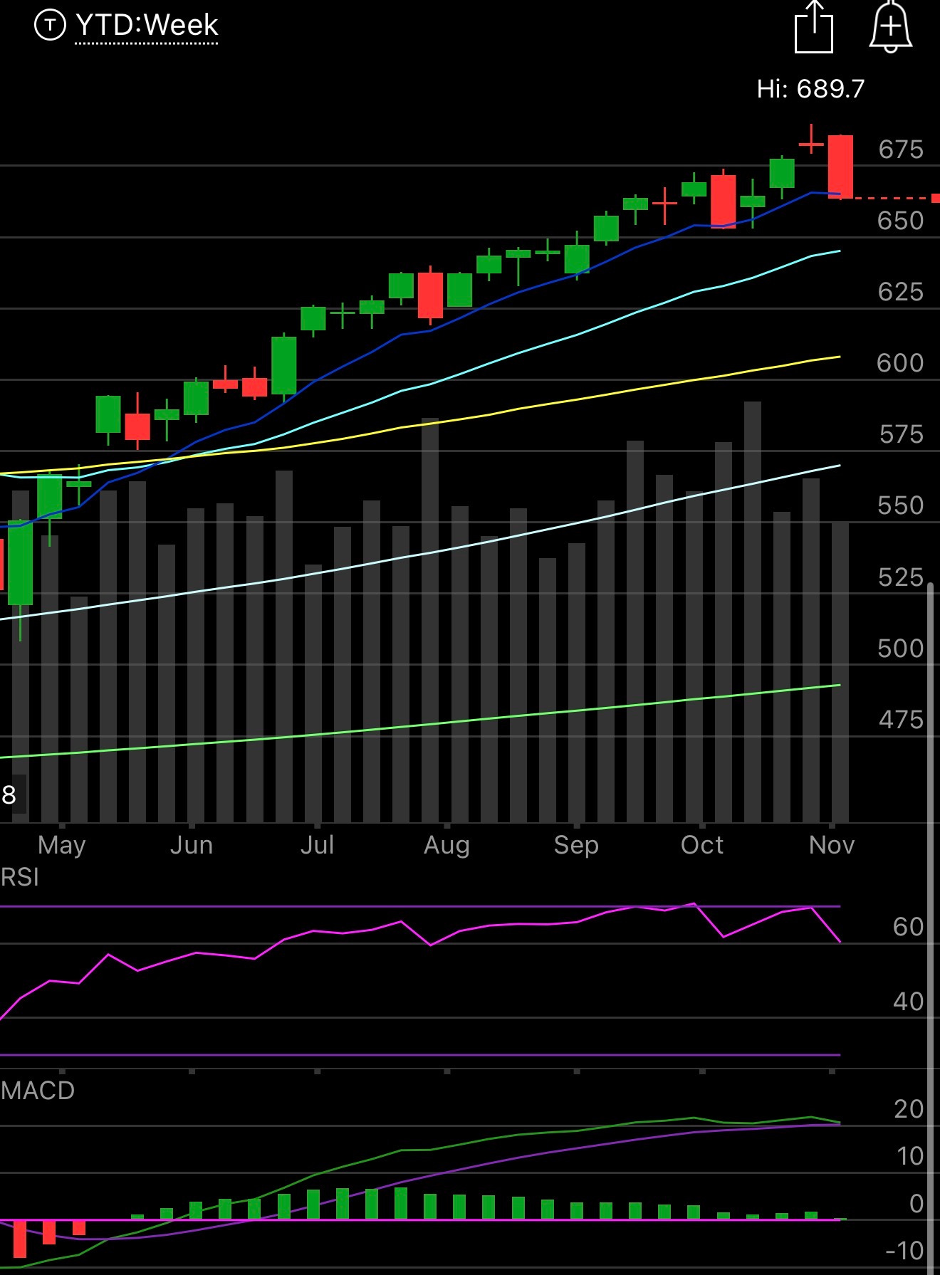 If you look at a longer term view, we are losing the 8 week potentially on a close for the first time since April as well on the SPY. All these warning signs are telling you to just step aside if you don’t want to get chopped up. We have a couple catalysts coming up that could potentially spark a turnaround, one would be the end of the government shutdown and then we have NVDA earnings coming up soon. Other than that, there isn’t much here to prevent us from heading down to that 21 week around 650. You see my book, I’m not super concerned, they always save the market, but I have shifted alot from tech to some of the names working right now. The reason I’m not really bearish is Trump has managed to tie the health of the economy to stock prices with his rhetoric, he can no longer blame this on Joe Biden like he did in April, so for a President who loves to tell everyone how great markets are and thus his economy, I’m not concerned about a long term move down because he will save this sooner than later with something. We could end the government shutdown sunday and gap up a ton, its just really hard to be long term bearish when we literally have to push equities up all the time to keep society functioning properly. Be cautious, but don’t panic.