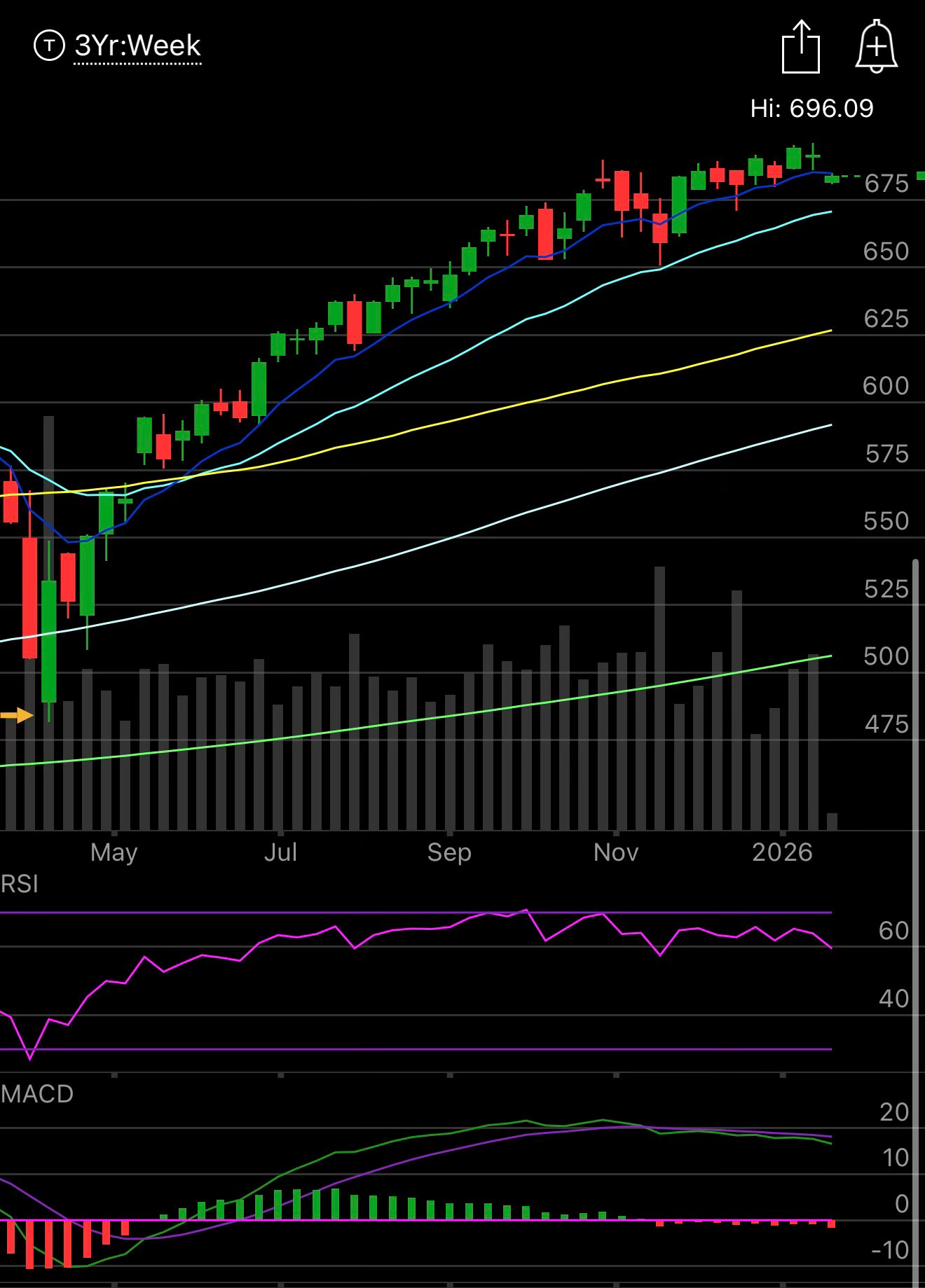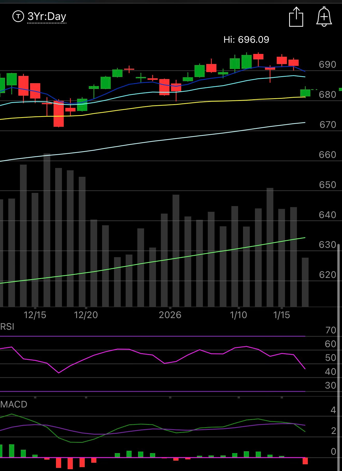 The SPY gapped down big overnight on a myriad of things from an escalation in the Tariff war with Europe to Japanese rates rising. So far the they bought the dip right off the 50 day and we need to make a sharp move back higher before we get a bearish 8/21 ema cross down. The market has been trading heavy, we’ve gone sideways for a few months mostly and now this could be the beginning of something more. On one hand you always have to worry with Trump in office as Greenland is warning residents to prepare for invasion now, but on the other hand Trump is in a pickle where he has built his entire persona on the stock market being representative of his economy and every serious move down he backs off his initial plan and saves stocks. So while we could have a small bumpy period here as who knows what is coming with this Greenland takeover, at the end of the day as we’ve seen over the years, Trump chooses to make stocks go up over anything else and with midterms 10 months away, the last thing he wants is his market to suffer for a prolonged period.