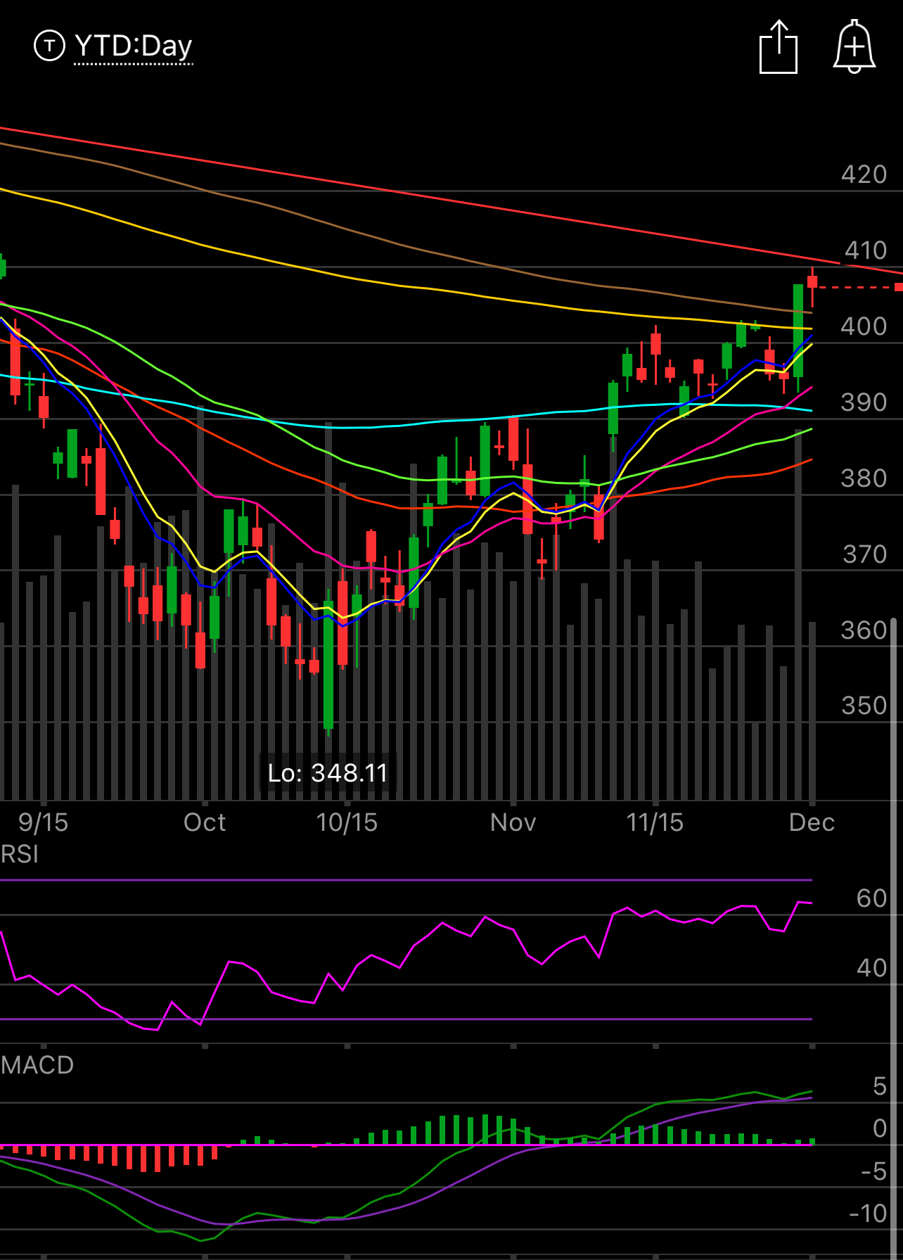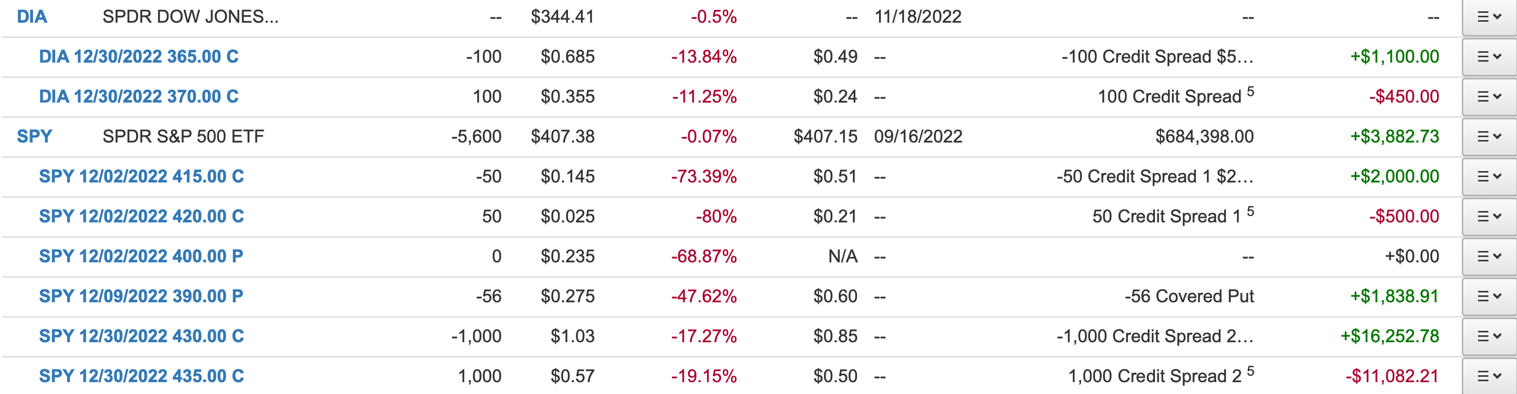 I was slightly green today, my heavy SPLK exposure probably helped alot because the market was slightly red and I had put on some short positions yesterday but added more today over 409 taking my average up to 407.25. Right here, for a few days of course, I’m going to give this short position a go. I’m all in. I have my conviction, I waited patiently to get my spot and I’m going to give it a whirl. I added more of the 430/435 bearish call spreads I had for 12/30 today at .48 and .49. I now have 1000 of these.
