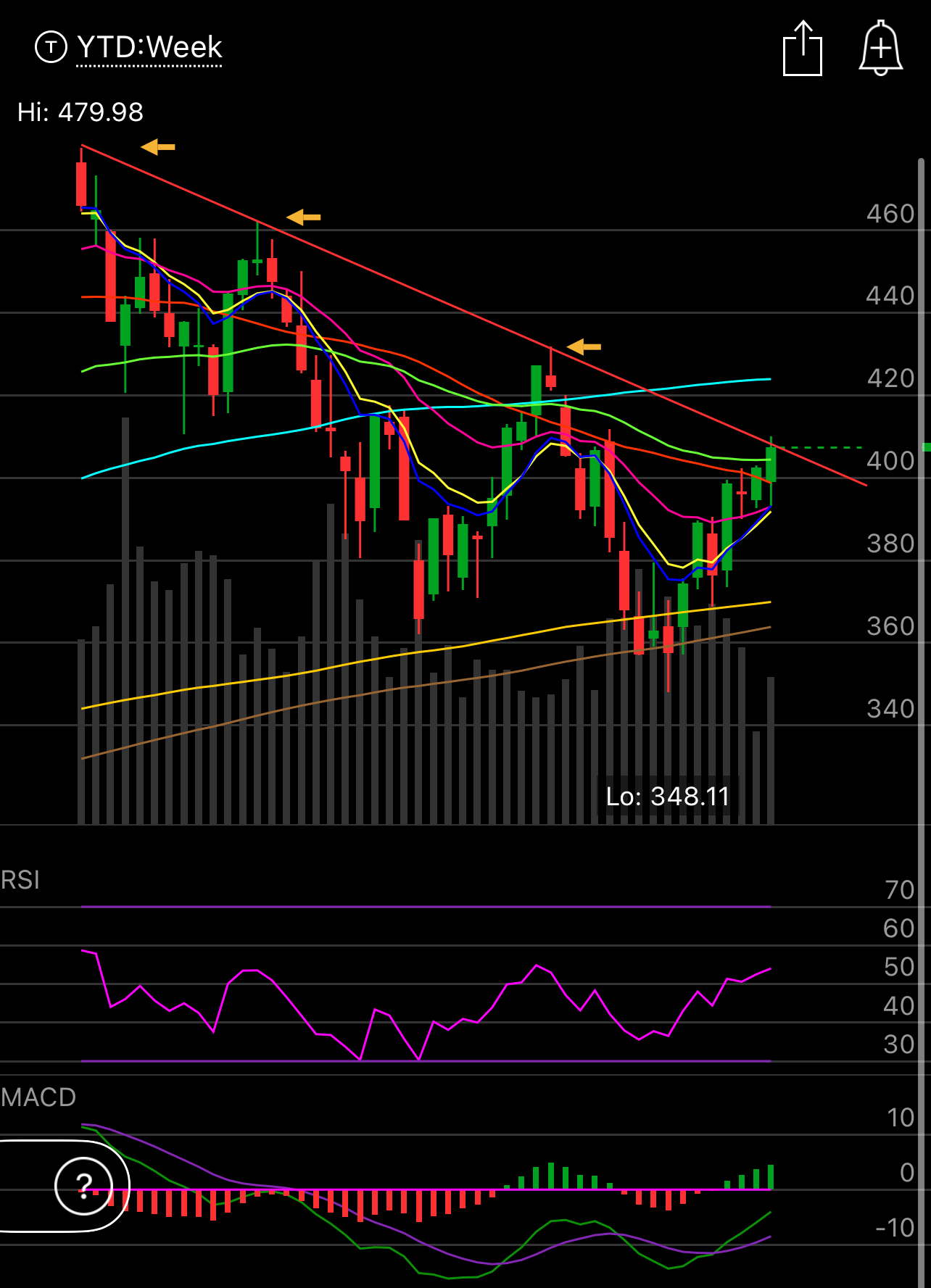 The SPY continues to look good technically with all the moving averages sloping up and a close over the 200 DMA and EMA but we’re running into that year long trendline. Hence my short position, my basis on my SPY short is 407.25. I have been pointing at this trendline for weeks in here and my thinking is that if I’m wrong, great, I will lose some money, how much? I don’t know but I know I need to see a close on the other side of this trendline and right here, I look ok for the moment.