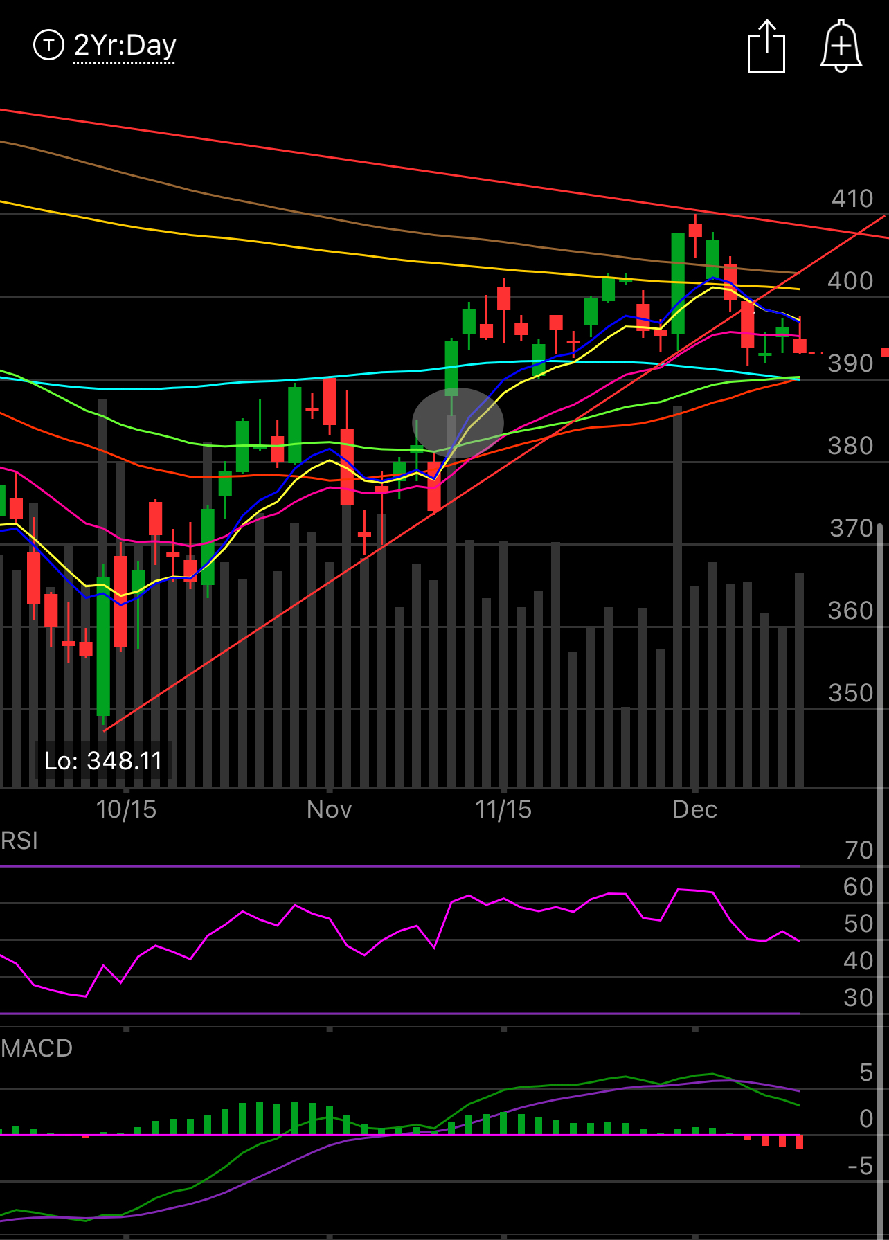 The uptrend in the SPY from October is clearly broken, there is no debating that. The SPY closed with an ugly inverted hammer candle on friday. The RSI is pointing down and the MACD is negative all signs telling you this isn’t where you are long. The downtrend above is somewhere around SPY 405, you basically are taking on all this risk of the Powell speech and CPI being great for maybe a 3% upside. The reason I say that is because until we close on the other side of that downtrend line on a weekly candle, the downtrend will continue to be a point of stiff resistance. Maybe tomorrow we get one more test higher, but for now, we are in this no man’s land over 390 and below the downtrend. CPI brought the worst day of the year in September, it’s just an event, in this environment, which is akin to earnings, whether you like it or not. I will be lightening up a few positions tomorrow, I’m not even long anything, just short puts, but some of the ones at risk potentially, I will be closing and freeing up margin to attack whatever comes our way AFTER Powell. That gap at 380 still is the first natural spot that I am looking for. Make no mistake, regardless of your bias, there is not a thing in the chart below that says it is to be bullish. Remember charts don’t lie, they just show you the movement of money.