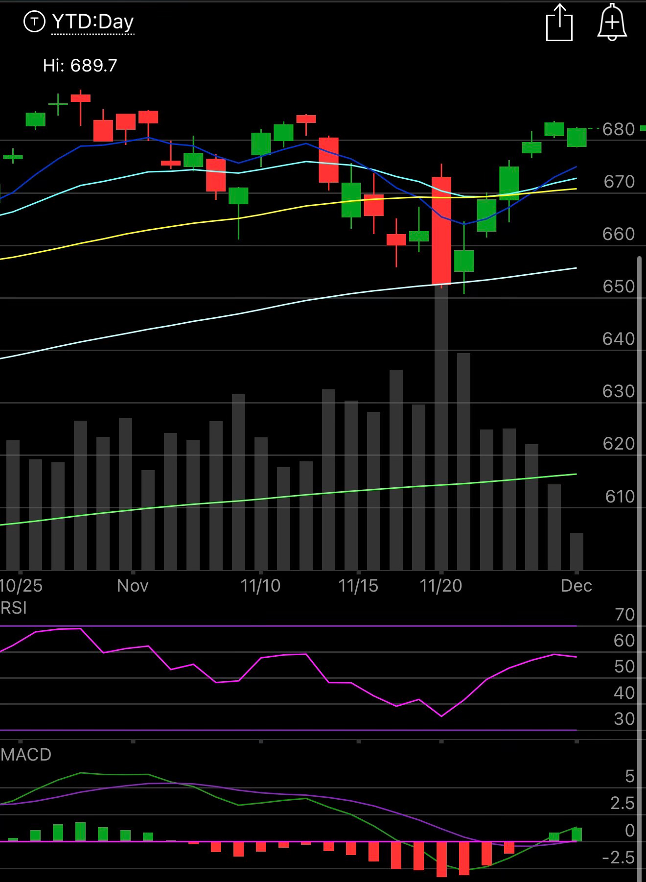 The SPY gapped down big overnight and has reversed alot of it, but more notable is we are still forming another lower high. Look at Friday’s candle, it never took out the high from mid November. Until it does that, this is just a continuation of a downtrend. Tonight we have Powell speaking at 8 pm EST, so let’s see what comes of that. Overall we are in a short term uptrend here, the 8 ema crossed up through the 21 ema but we’re forming a lower high for the moment in a longer term downtrend, so that uncertainty is why I’m exercising caution myself after such a great year and moving aside.