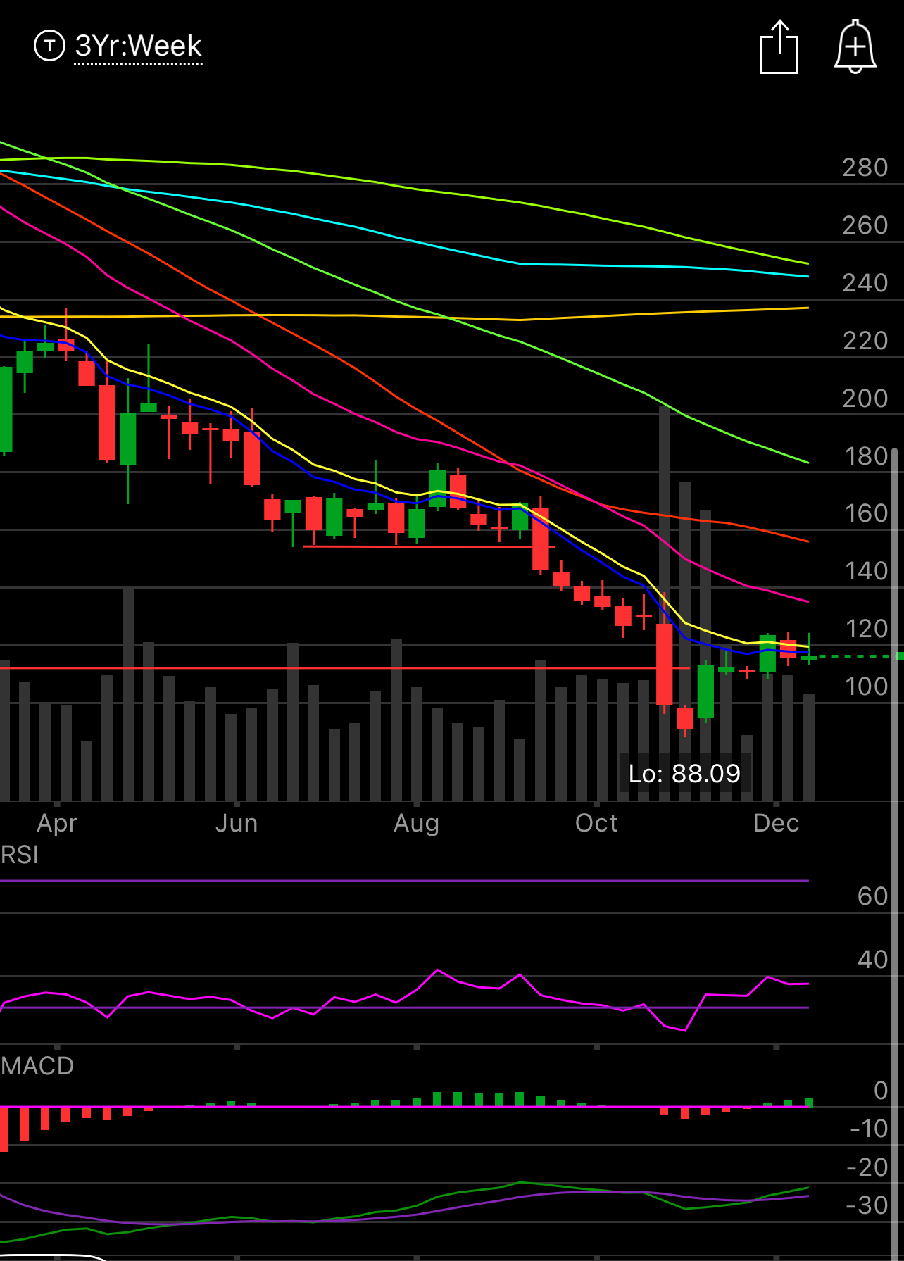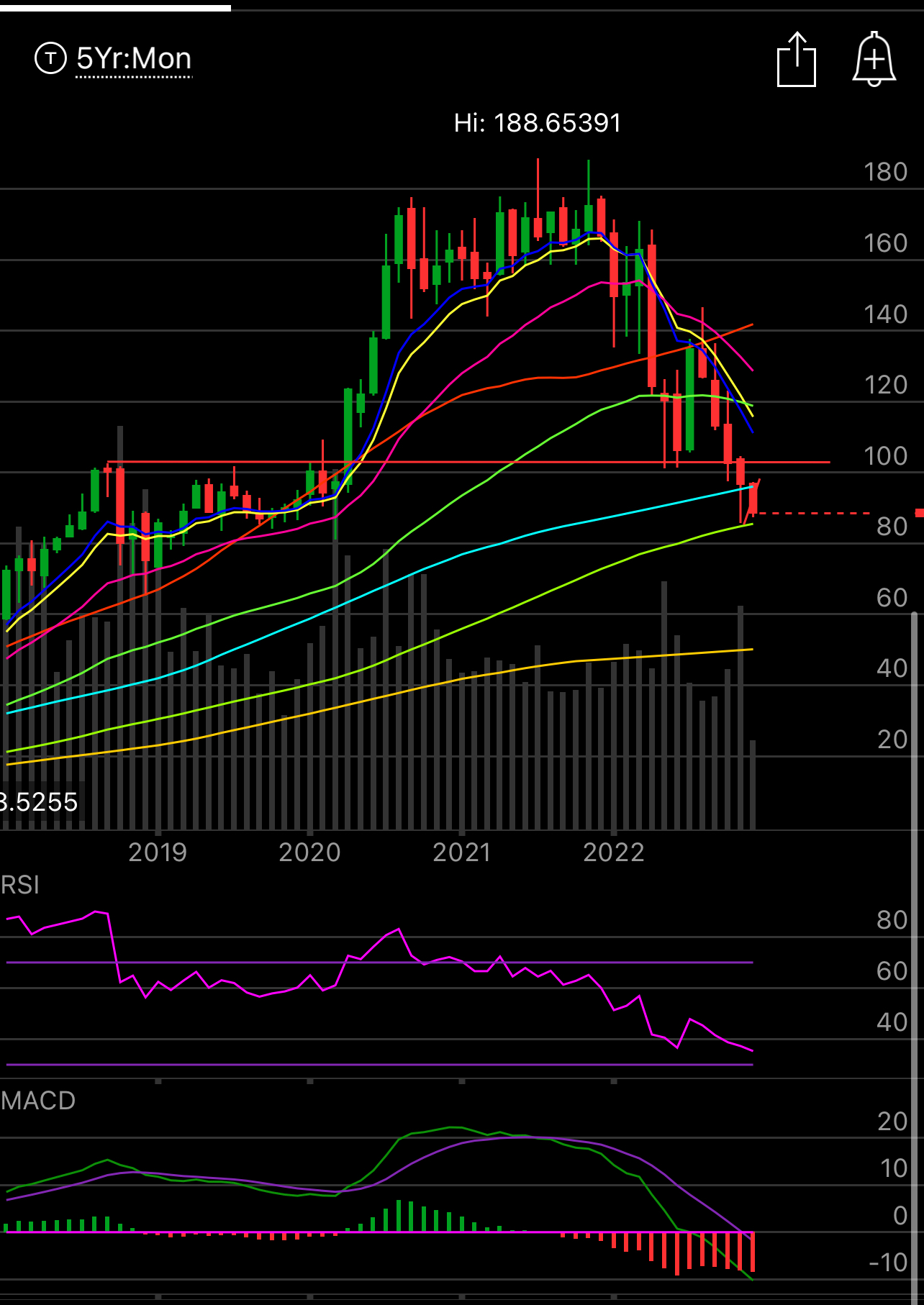 The Amazon puts I sold are tricky. This equity looks horrible, look at this monthly chart below. The RSI on the monthly is at its lowest point in over a decade, this is so beaten down I can’t suggest a buy no matter how good the valuation is. Just sell puts and hope it falls to you but $75 should hold, aside from being sub an $800b valuation it is below the covid lows and around the next big support level.