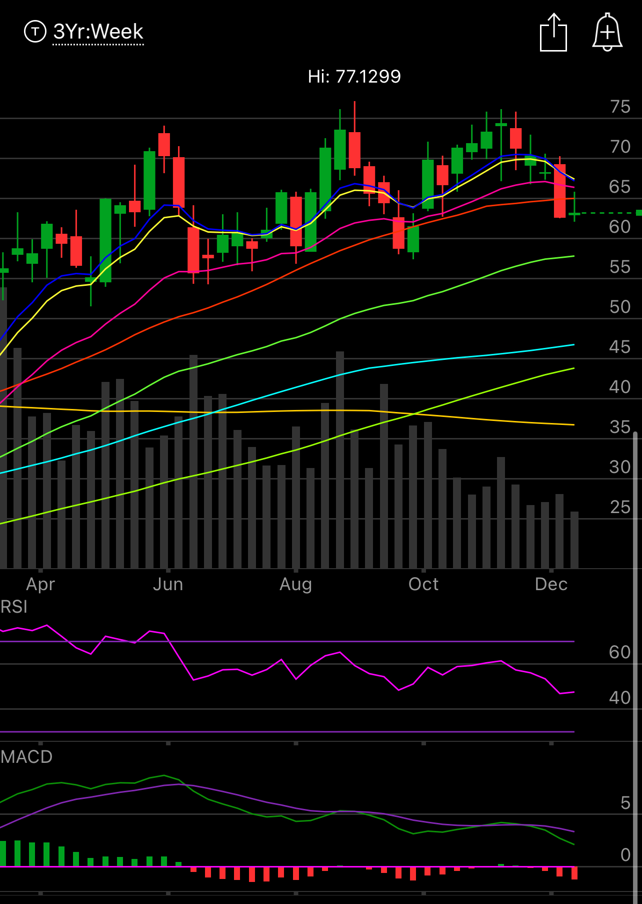 The OXY weekly chart lines up with the 57.5 short puts I’ve sold. 58 has been the level where Mr. Buffett continues to add and I’m going to use it as my spot to attempt to catch this falling knife. Oil hit oversold levels this week and has had a nice bounce since.