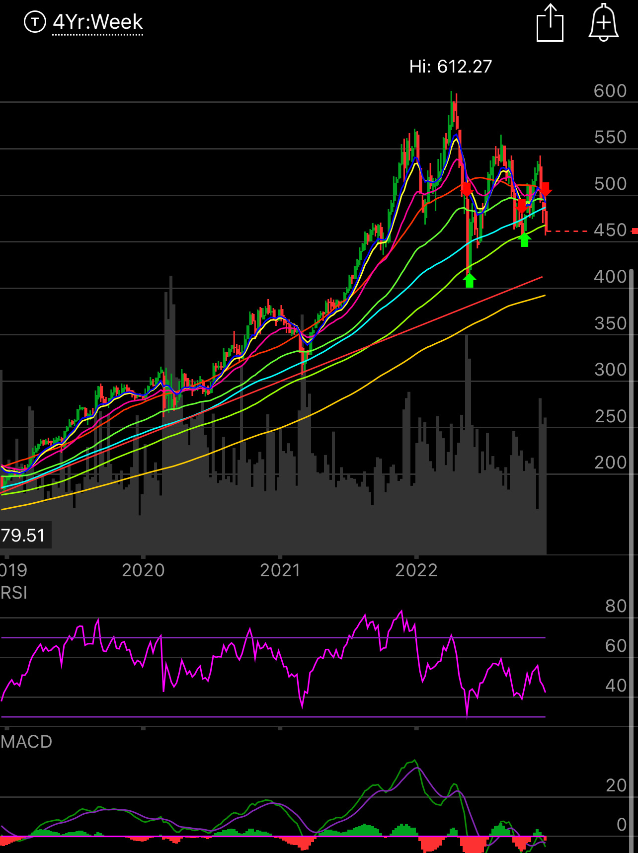 What you will notice with me is my trades are prolonged. When a chart is strong and option flows are bullish in the name, the move is extended. Take my favorite name of the last few months, look at this uptrend Pinterest has been in. It’s clear as day what your risk/rward is here as it has never closed below that trendline on a weekly basis. It is a smooth sailing uptrend. Even this past week it put in a GREEN candle, almost no name did that, everything had a red candle this week, but relative strength in PINS came through when it was needed most and the name closed higher than it opened in a complete bloodbath for equities, especially tech.