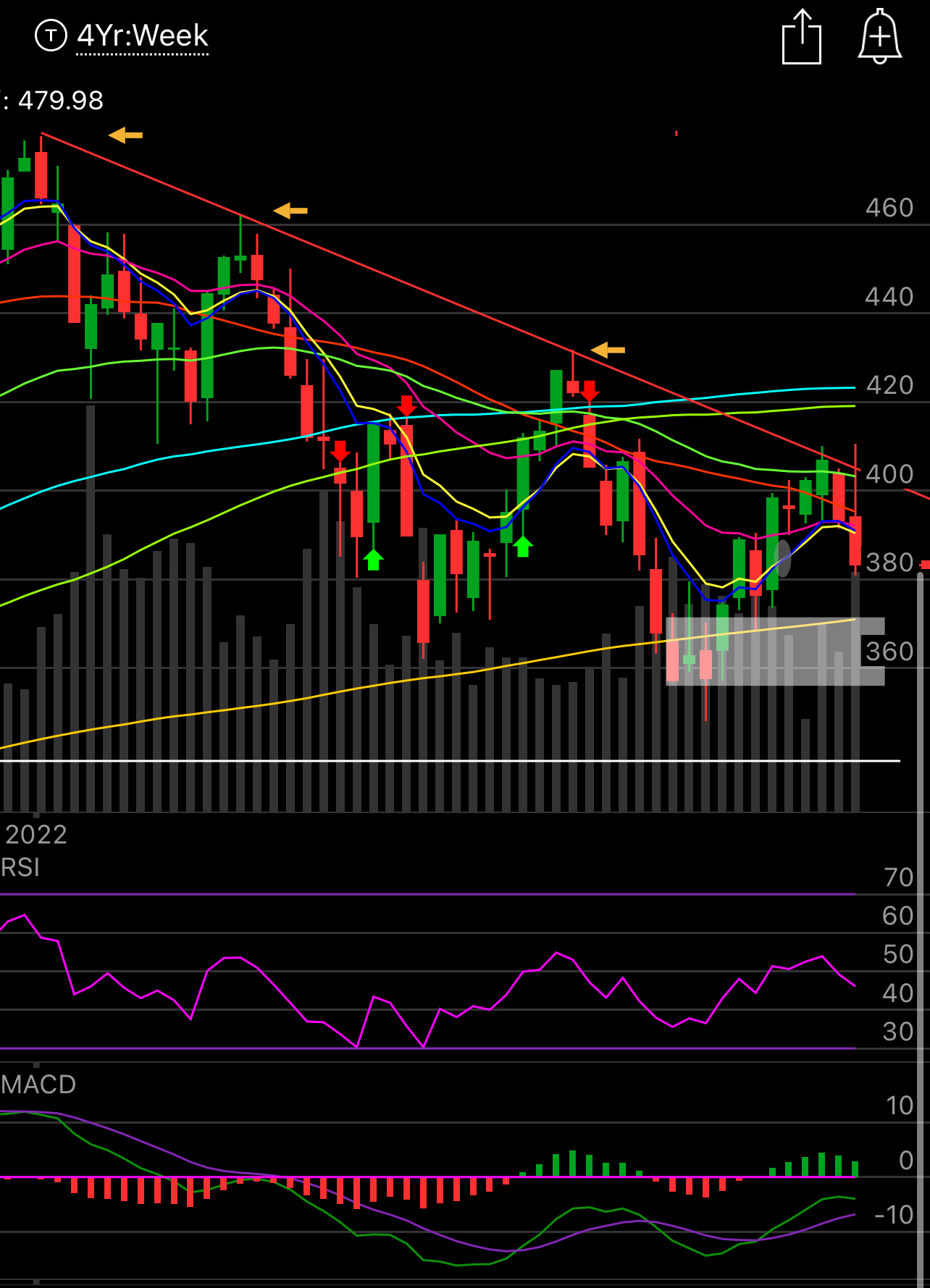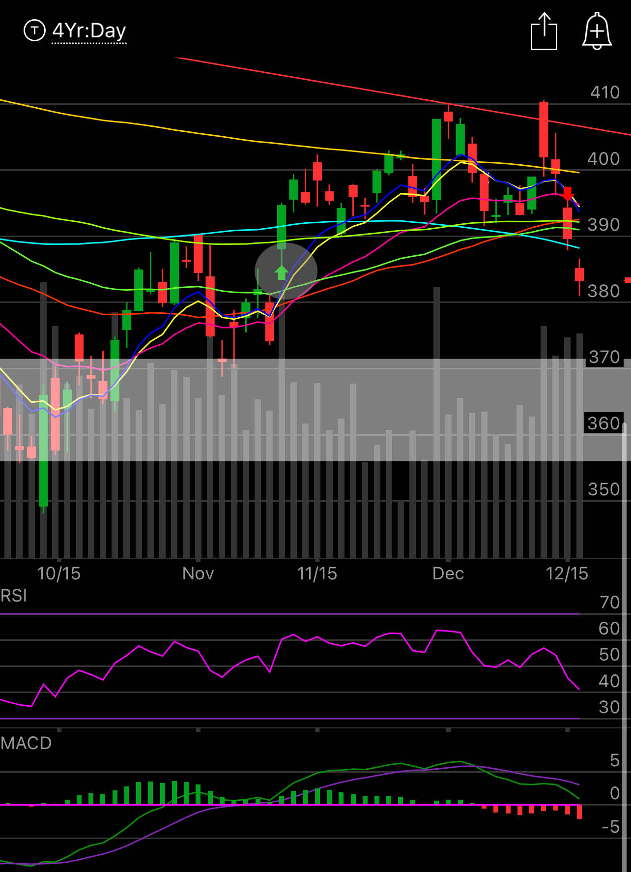 What’s fascinating about yesterday is we filled the gap perfectly that I’ve been highlighting for a time at 381.14, we went 10 cents lower and that was it for the day. Textbook really how mechanical the market is at times. The white box I highlighted below is the demand zone where I think we’re headed to. Short term, could we have a deadcat bounce? Sure, with a move big like that last week, we may see a bounce here, but volume will be abysmal the next 2 weeks as most people aren’t in the office for Christmas and New Year’s.