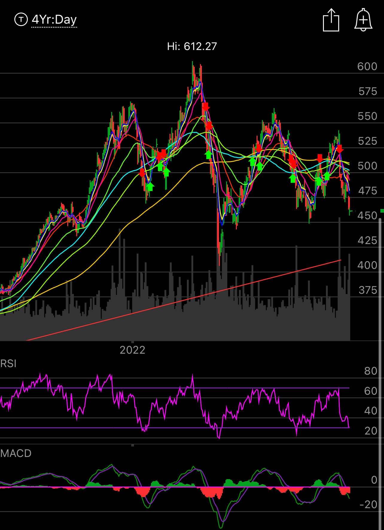Costco looks awful, this is another like Apple yet to breakdown. Look at the uptrend(red line) going back a few years, now we’re about $40 away and it looks like destiny for this name. The stock still trades at a nosebleed valuation for a retailer.