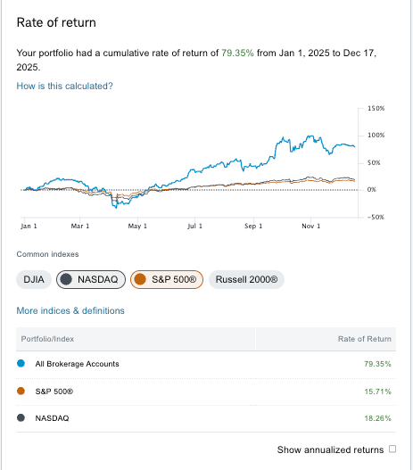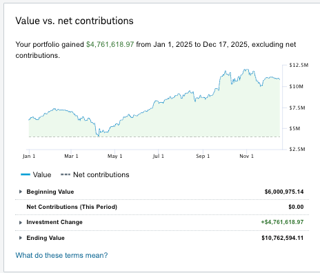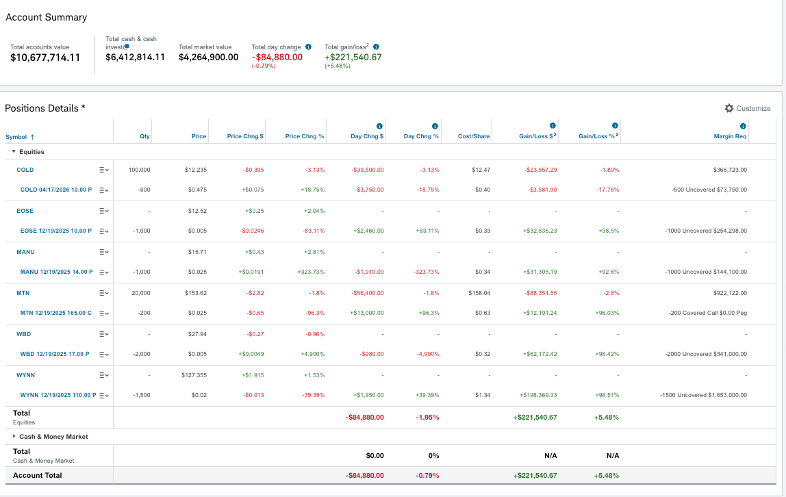 I made zero changes today, lots of stuff expires tomorrow and my year is over. As we get late in the year if COLD and MTN are still red for me I may harvest those losses, but I do like those two names into 2026.