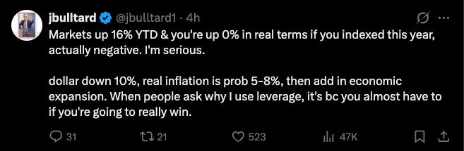 I think next year is going to be a year for these high yielding names as we cut rates. These names with these huge yields are gifts in this environment if you’re a long term investor. As we start to cut rates, I think you’re going to see the demand for 6-8% yielding names go up alot and Trump has made it very clear he basically wants rates at 0, now that won’t happen but you get my point, he wants materially lower. As for the tech names, I don’t know how I feel, I feel there will be a reckoning with all this capex and investors wanting returns, but I also think some names like Amazon that lagged for so long will do well as they catch up. Overall we’re coming off 3 straight years of 20% returns basically on tech stocks, and year 2 of a presidency is historically the worst. I don’t make long term predictions but we do go up 90% of years, so up wouldn’t shock me, but up in real terms is what interests me and that means up factoring in inflation and economic expansion, like I tweeted this morning, I think if you performed inline with the market you’re actually negative this year if we want to be honest about things. When some of you ask me why I use so much leverage, this is why, I’m trying to outperform the market while also being in high quality names. Think about this post below as you approach next year.