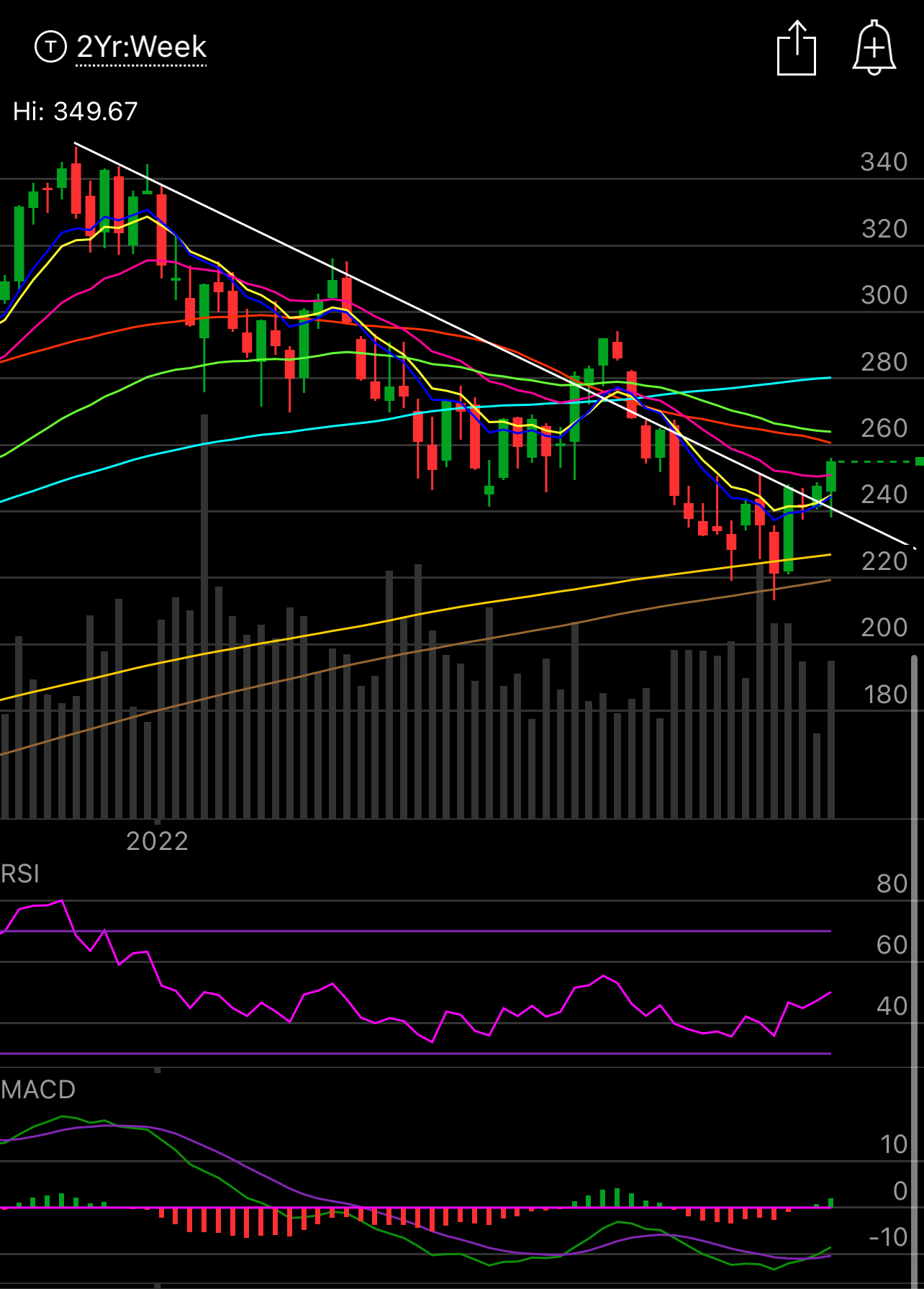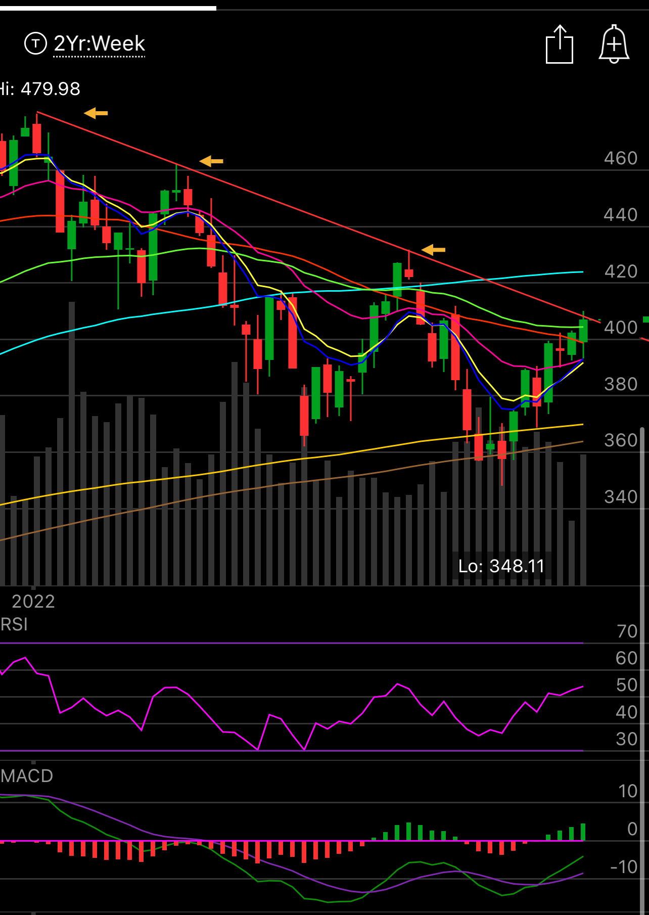 I drew this downtrend back in early 2022 when Microsoft was coming off its highs. I made the DT white this time because there were too many lines it was going through for you to see.If you look, all year we bounced off that downtrend and rejected lower minus that small breakout in July which eventually failed. Look at the low of the year, a perfect bounce off the 200 weekly, that is as textbook as it gets. For the moment MSFT has once again crossed that downtrend and looks very bullish as the MACD finally flipped green on the weekly BUT a bearish counterpoint would be look at how weak the RSI is, that is very valid and lines up with the rest of my thinking on this “rally” in the overall market.