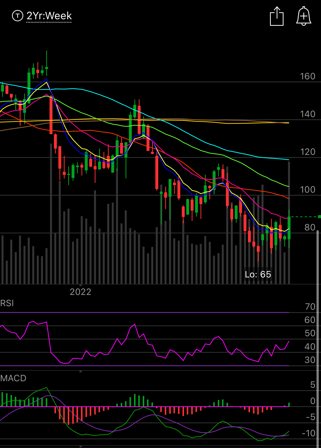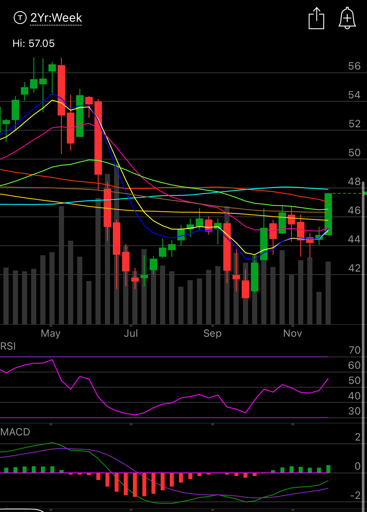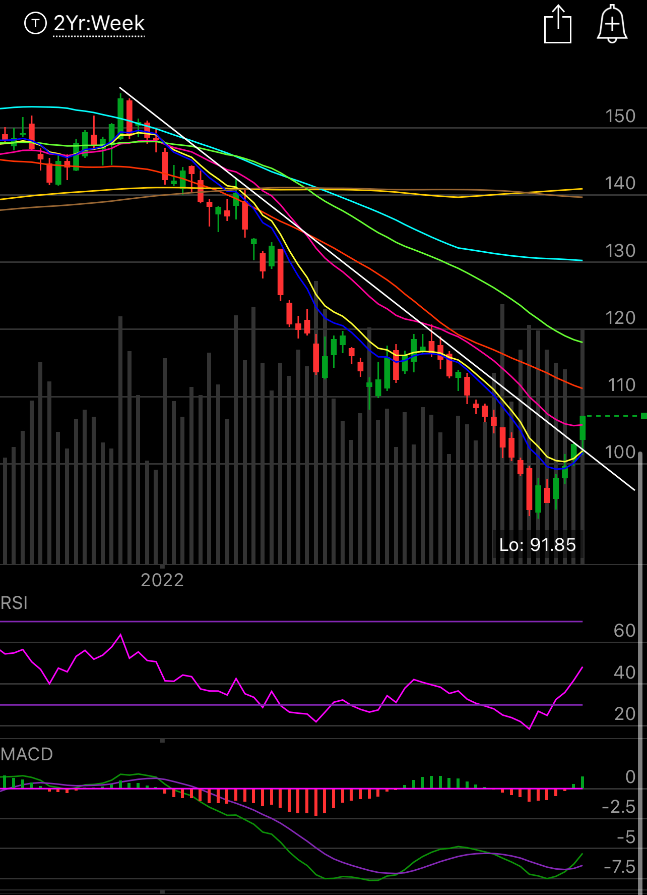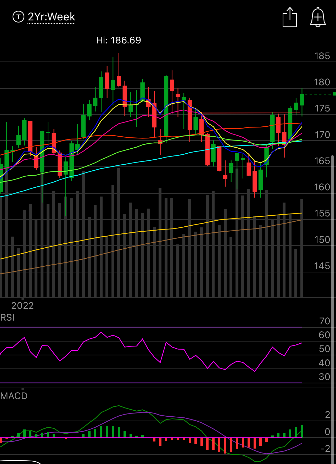 MO is a high dividend name I’ve mentioned before in my best ideas, the dividend is still almost 8% here today. The chart is nice, stuck in a confluence of MA’s for now, but that was a very nice candle last week.