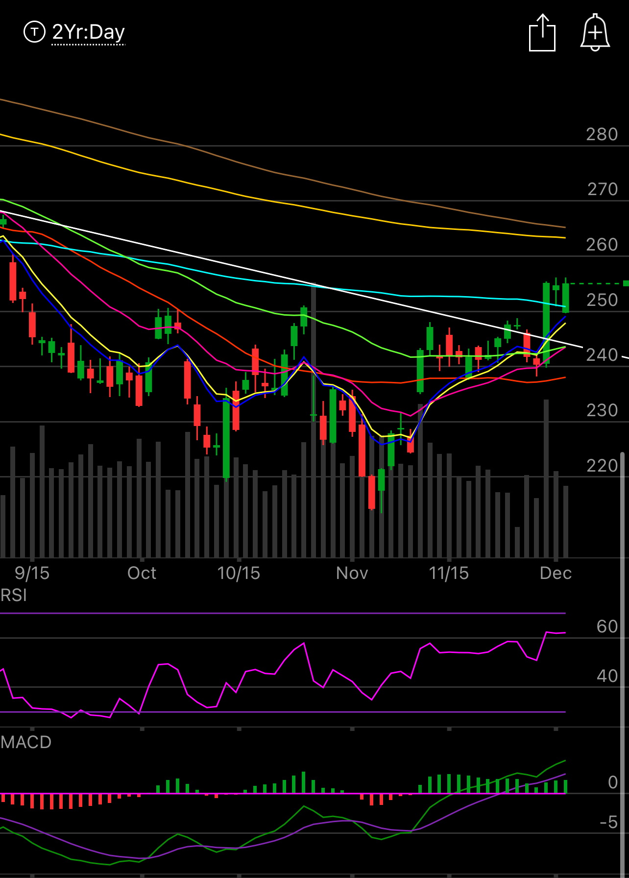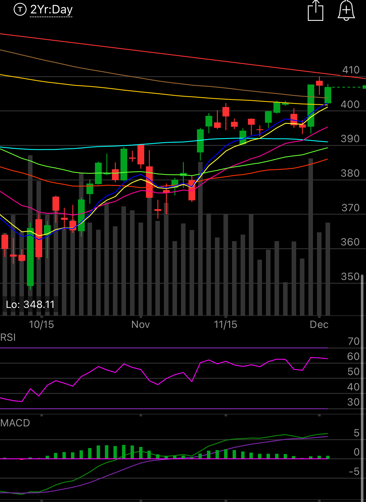 I think selling a 225/215 put spread for 12/30 is a prudent trade. Is it the biggest return? No but it’s conservative and calculated. At the moment you would receive .35 in premium while risking $9.65. Is that alot? Not really, its 3.7% but, it’s also a 4 week trade on an overheated market and anytime you can make such a solid return in 4 weeks on one of the 2-3 best companies in the world, in an uptrend, you should.