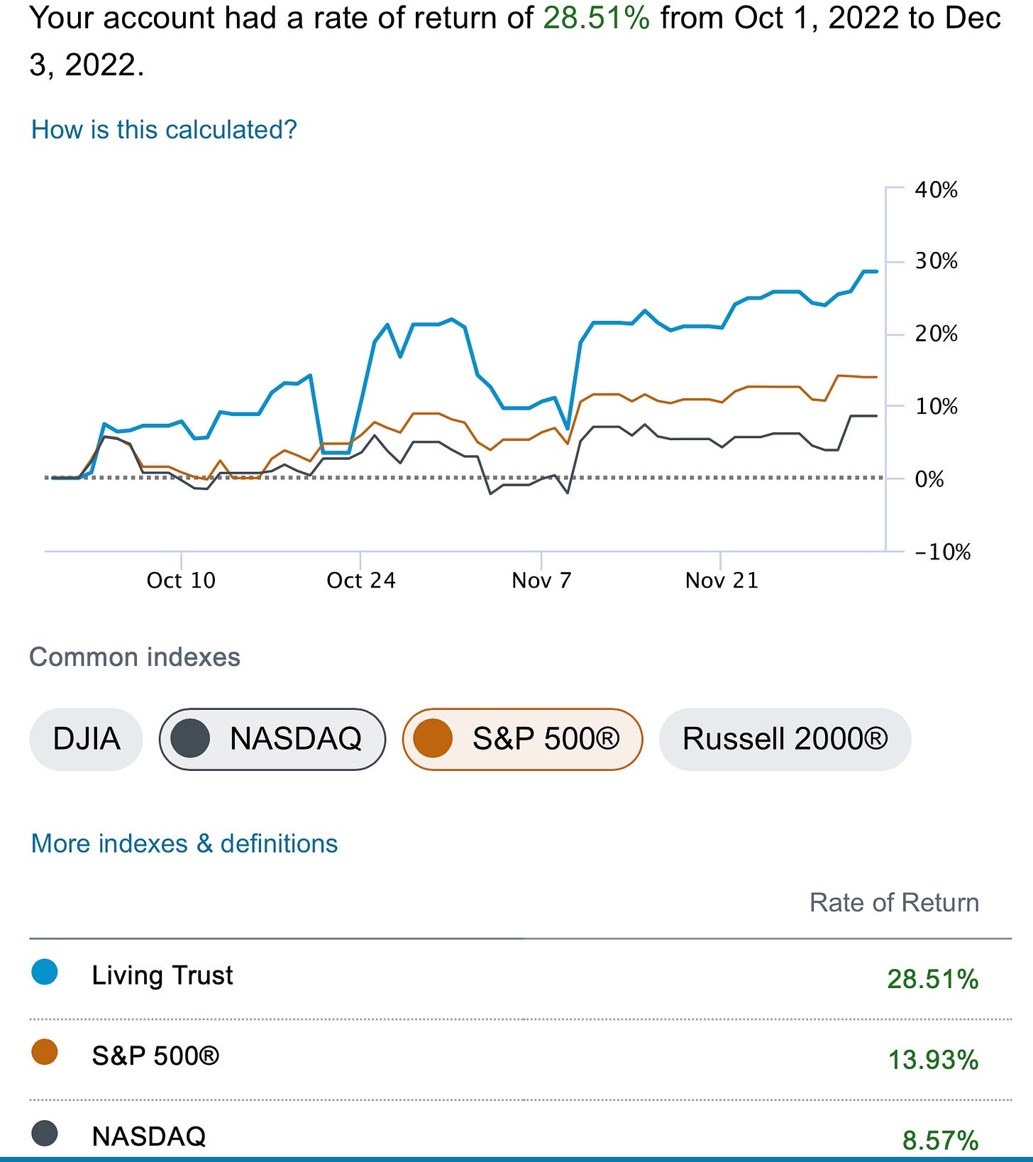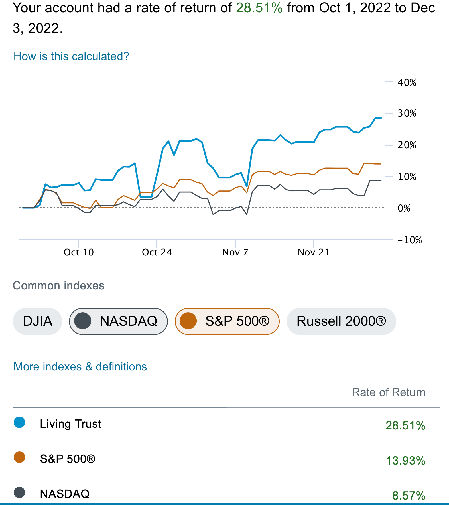 This has been another great quarter for me so far up 28.5% since October began outpacing the SPY by 100% and the NASDAQ by alot as its only up 8.5%