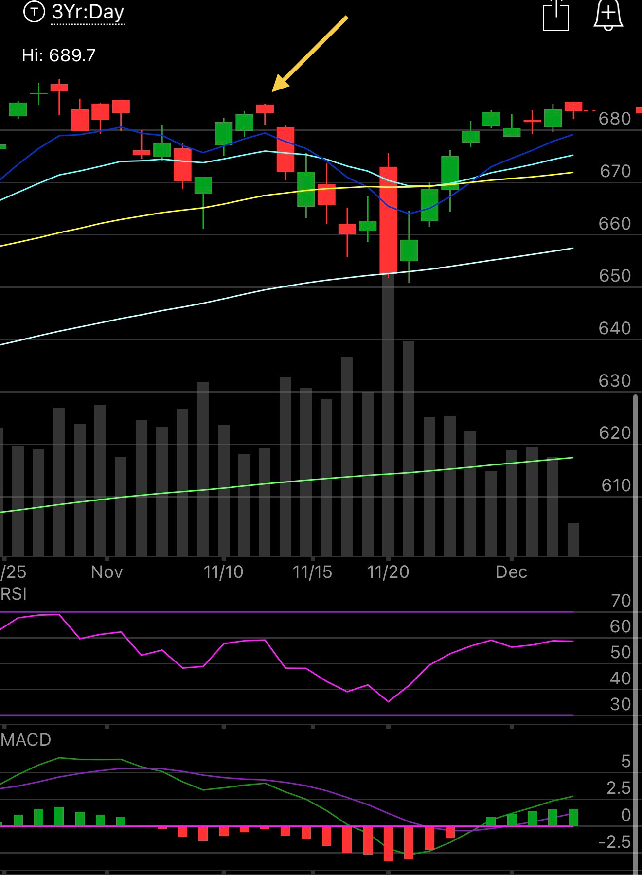 The SPY continues to be stuck in this zone where it cannot take out the early November highs, but it also doesn’t want to breakdown. Nobody could tell you what this is because it isn’t bullish or bearish until the market picks a side. It looks like a bull flag over the all the moving averages but it is still a 3rd lower high from October so until it moves decisively in a direction, there is nothing to say. Volumes are getting lower into year end, but that is expected and we don’t really have any major catalysts left, maybe Oracle earnings next week and what that will do for AI names. Otherwise, the year is basically over at this point with some fed catalysts along the way. I still am in the camp this hanging man candle will play out to the downside, this has been a weak rally where we can’t make new highs the last 6 sessions. Maybe I’m wrong I don’t know but that’s why I lightened up so much this past week.
