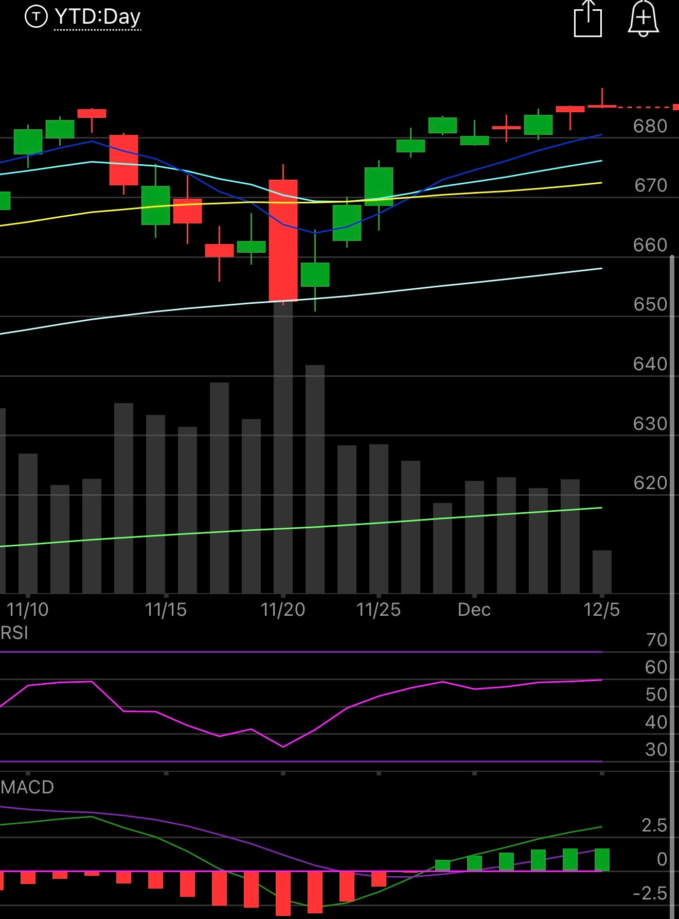 The SPY finally got over last month’s highs today after PCE came in and calmed fears. We were pushing back to highs, then reversed, but until we get over the 689.7 level, previous highs, this isn’t anything meaningful. We are in a so so spot now, I’m still wary of things because volumes are low here recently into year end but you can be cautiously optimistic with us now .5% away from all time highs. This has been a really weird move up with the biggest component in the market, NVDA, not participating at all. I’m still scarred from Powell and his 2018 Christmas action that crushed the market right before Christmas and what he may do in 2 weeks so I’m going to stick to the sidelines for now and hold my short puts. Also this is not the best looking candle so far today, but there is lots of time left, bulls do not want to this candle today closing at lows as it be a gravestone.