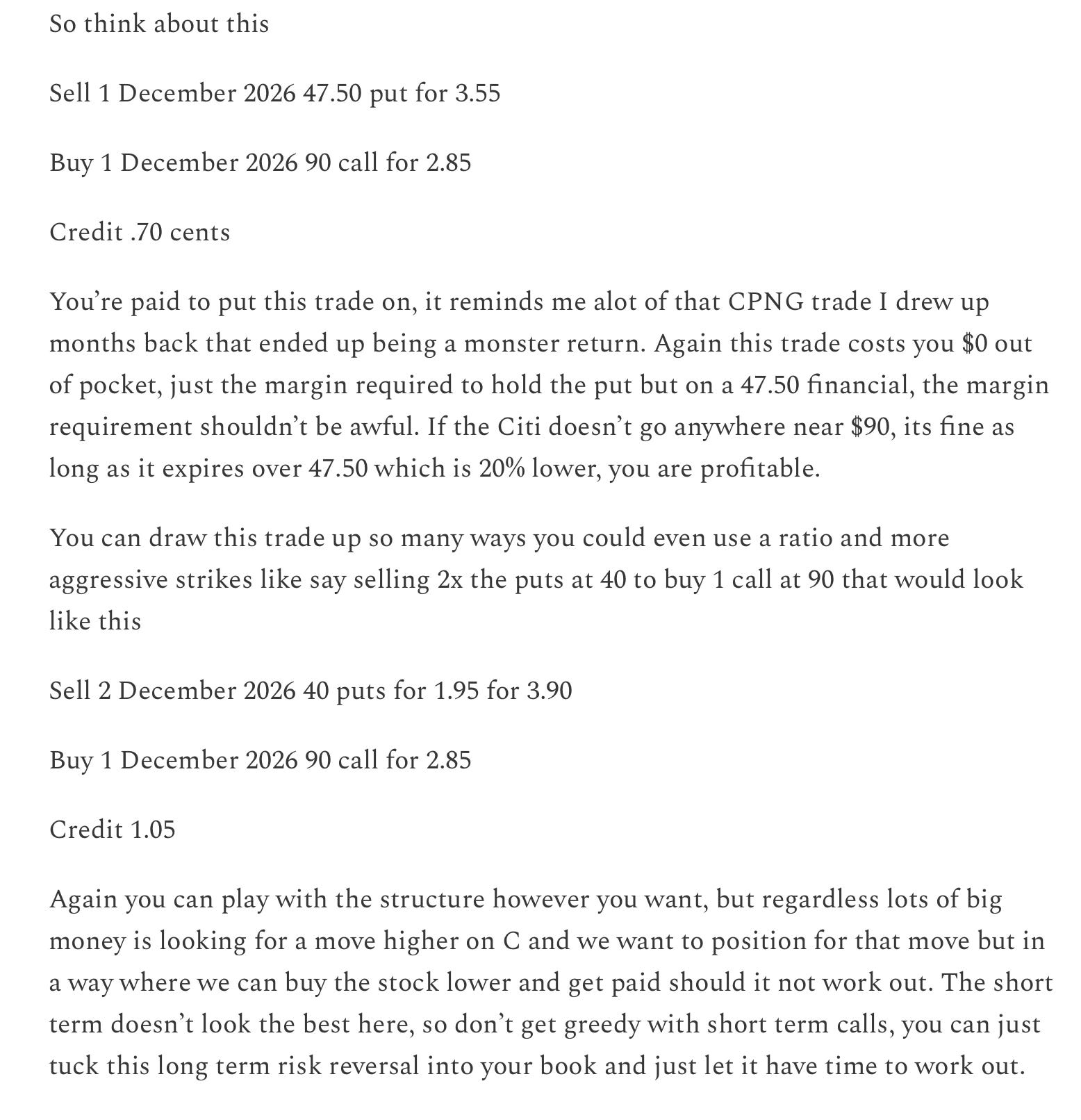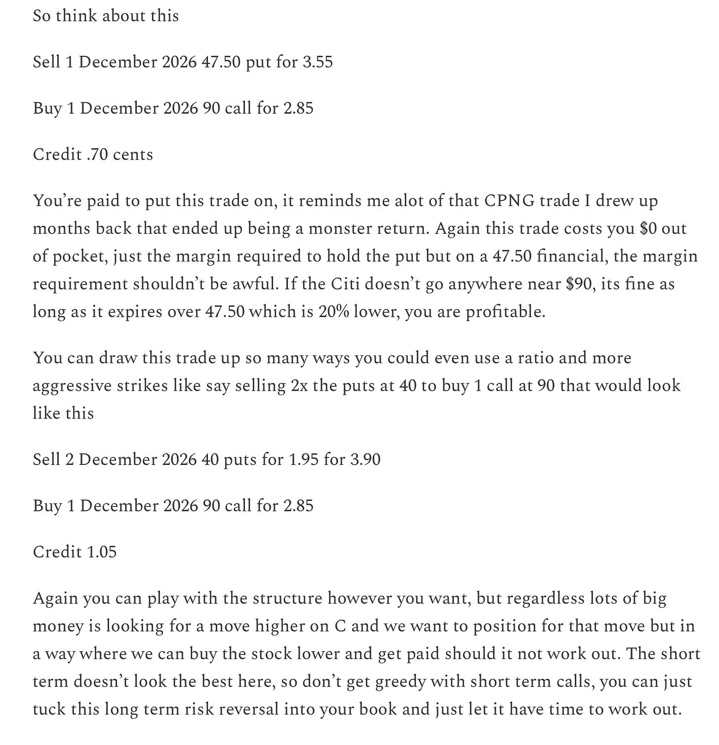 Remember with these weekend best ideas, they’re long term plays, they’re not short term trades to take and worry about what happens this week or next, they’re more names I’m looking at where you can add them to your book long term and be happy holding them via calls or long term leaps. Look at this Citi trade I posted 6 months ago as a weekend best idea here. Citi just had its highest weekly close since 2009 this week up over 33% in 7 months since I wrote it up below. They were all over the option flow if you remember then and the risk reversal I drew up below, the short puts are up over 60% and the long calls are up to just over a 3x in that timeframe and now you have another 23 months to ride that trade. The option flow is just a guide on direction, you don’t have to play calls or short puts, simply buying commons on the right name at the right time is all you have to do but should you choose to play options the returns can amplify your returns dramatically.