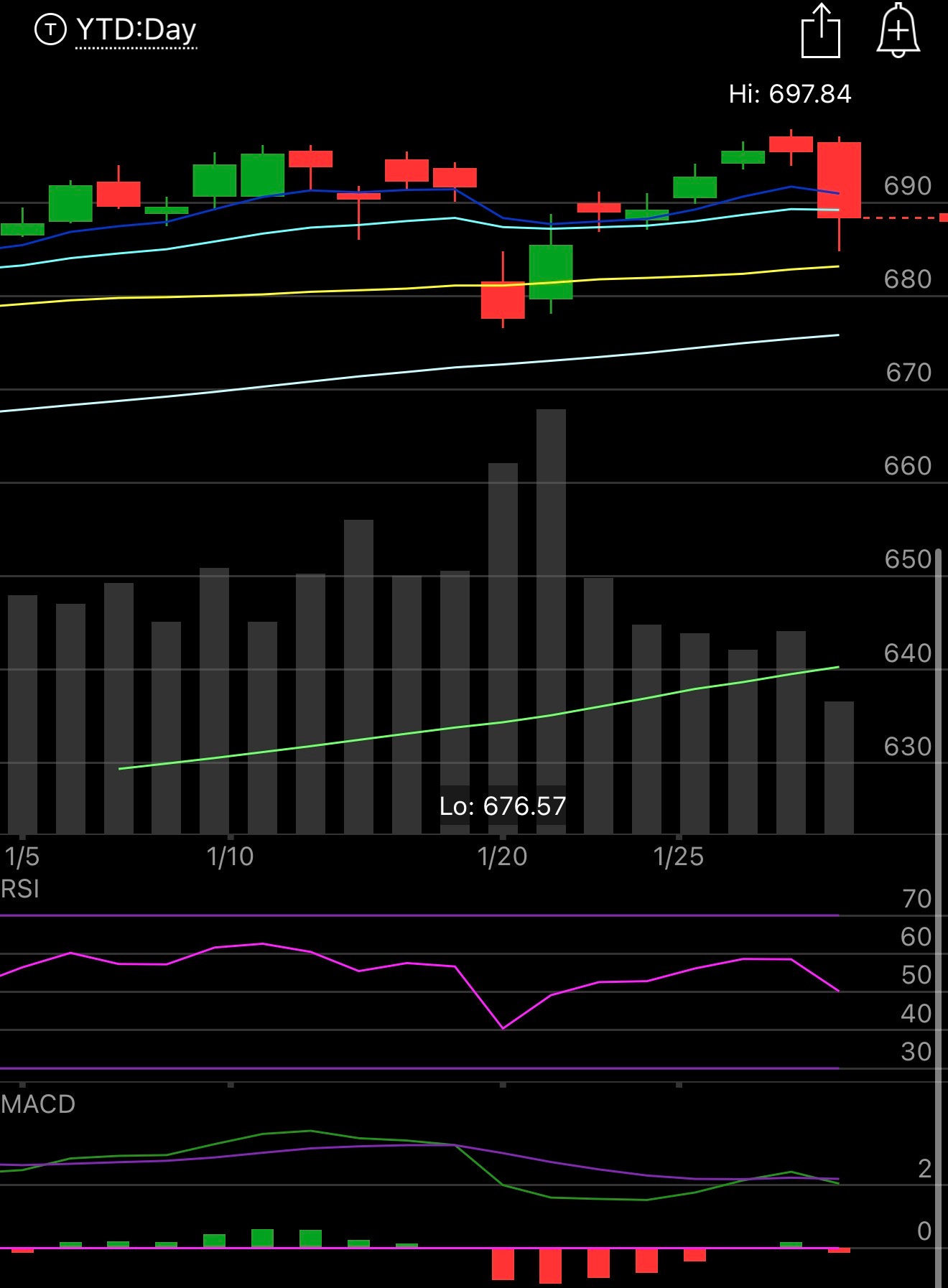The SPY knifed through the 21 ema today early but has recovered a tad so far, bulls would really like to see this close over the 21 today. The market is down big because of a multitude of things take your pick we have our biggest carrier went dark meaning a potential attack on Iran is imminent, we had oil prices spike, and we had a disaster report from one of the biggest companies in the market with MSFT down 12% right now with one of the single largest single day market cap drops in history. What happens next I don’t know but as long as the VIX is perky like this you really don’t want to be buying premium, you want to be selling it if anything but with the weekend coming up and who knows what regarding Iran, it probably is a better time to just keep your positions and not add much until we have more clarity.