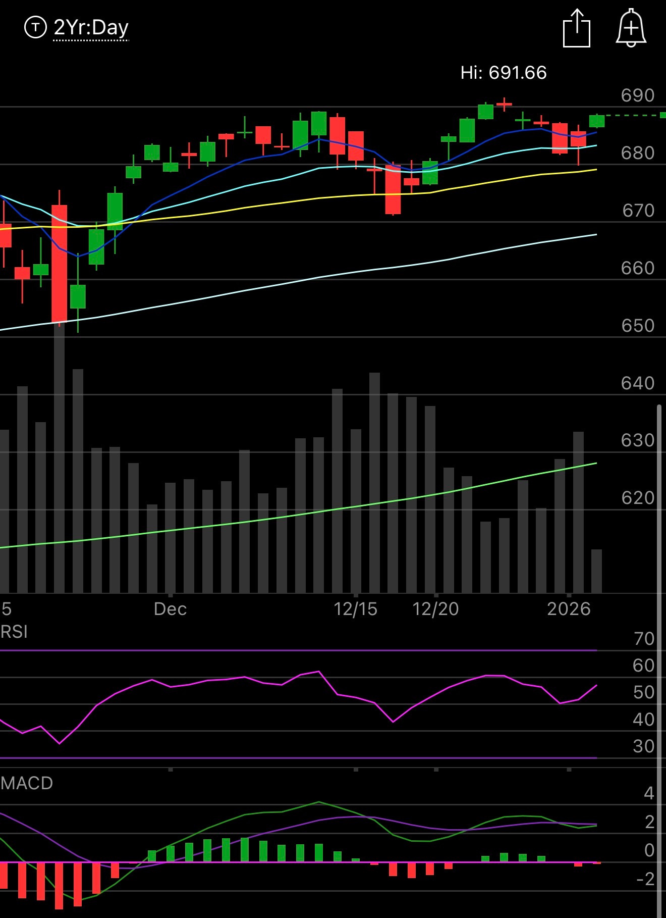 The SPY broke a small downtrend this morning and is now sitting over the 8 ema and in a good spot especially if it can take out those 691.66 highs from last week. We had an ISM miss this morning but right now it seems like the market isn’t worried about much as we wait for earnings season to kick off here shortly. It’s a new year, people are deploying money into new positions, I logged more 10,000 lots today than I can ever remember, and there isn’t much to say as we are cruising over all the key moving averages for now. Just keep your eye on that 21 ema at 683.34 right now, we’ve only seen the daily close under there once in the last month but as long as we’re over it you should be pressing longs.