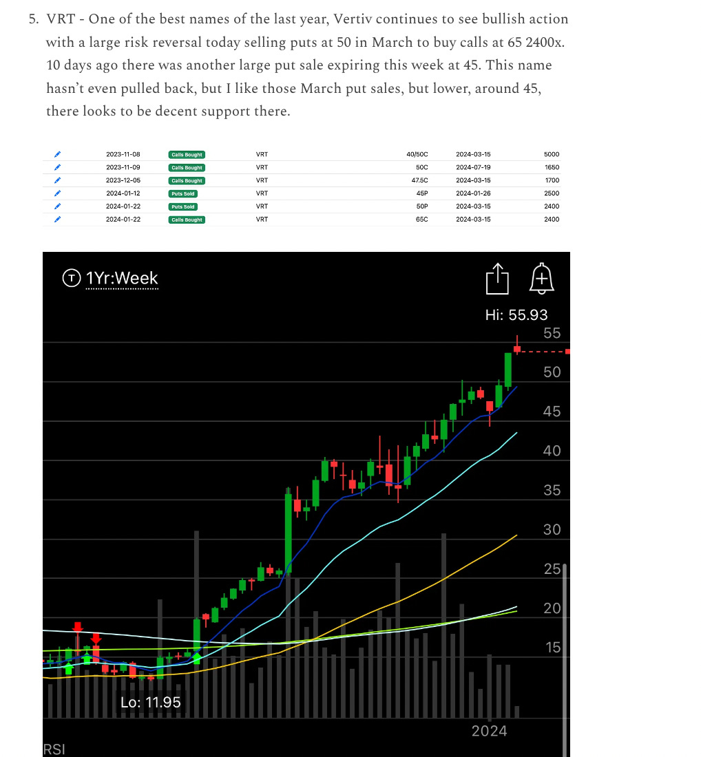 VRT was highlighted in the 1/22 recap. If you noticed it was one of the top trending names of the past couple weeks. Relatively speaking for this obscure name not alot of people trade to have the amount of bullish action we saw the last 2 weeks was incredible. There was alot more today and the stock is up 10% since the post below 2 weeks back. When you see a name you don’t know in the trends seeing repeated bullish or bearish action, you should probably pay attention.