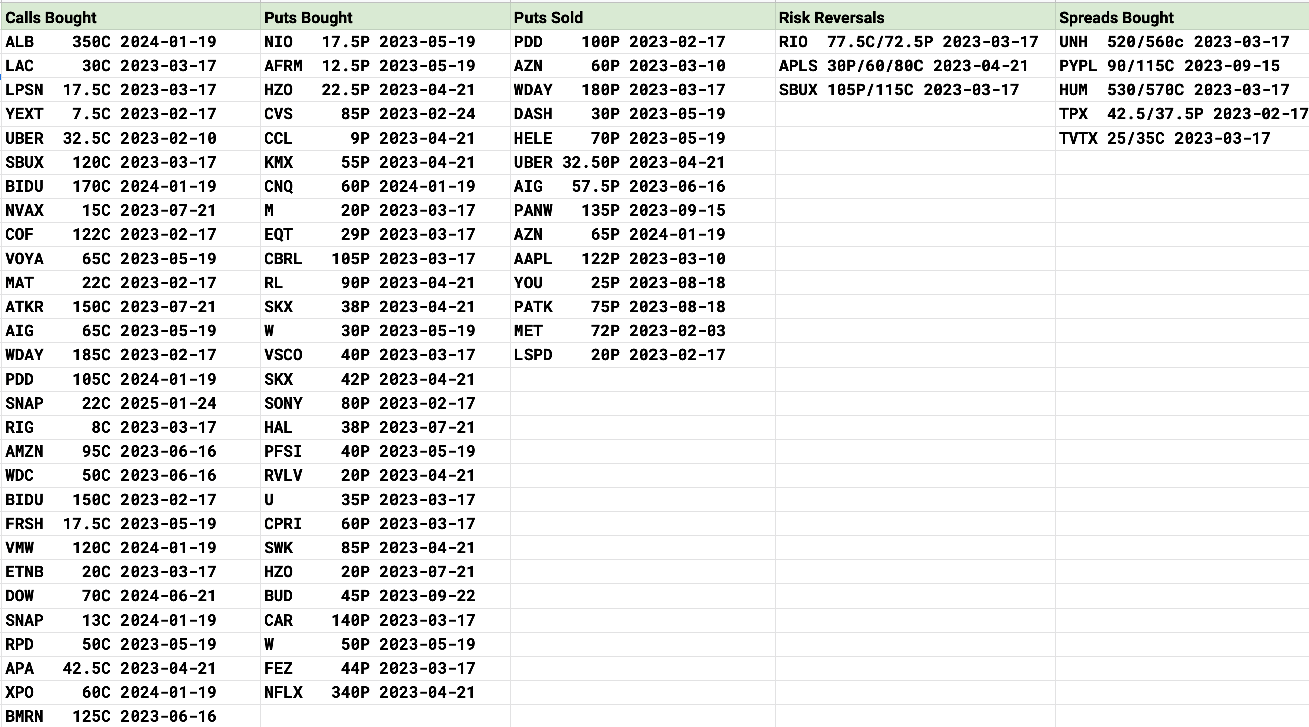 I had alot of new people come on today, so here is where I post the trades I felt were unusual today. It’s pretty straight foward calls bought(bullish), puts bought(bearish), puts sold(bullish and levels institutions are interested in going long), risk reversals(ultra bullish or bearish), and lastly spreads bought. I use these as part of my discovery process, along with charts in deciding what I want to do. That’s it, I don’t follow all of these or anything, they’re just 1 step in the wheel of discovery.
