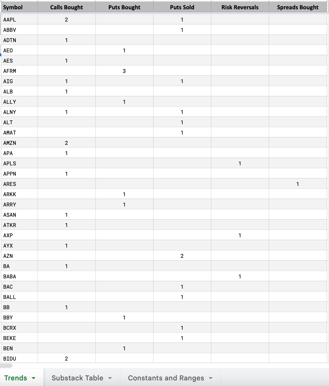 So we’re now 3 days into collecting all this unusual options data into a database and you can already see the trends developing down below where something like Affirm now has 3 unusual sized put buys in the last 3 days. I’m confident in a few weeks/months this will turn out to be a useful tool for gauging trades.