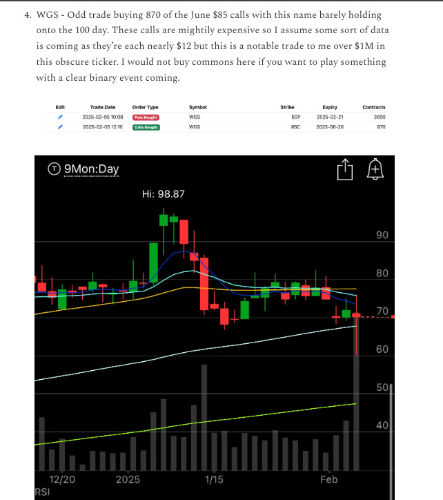 WGS - I flagged this one 2 weeks ago in the 2/5 recap here. It is flying up 35% today and those June $85 calls went from $12 to $31 today. Great 2 week trade.