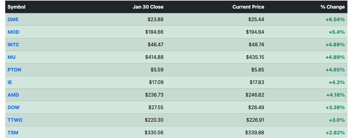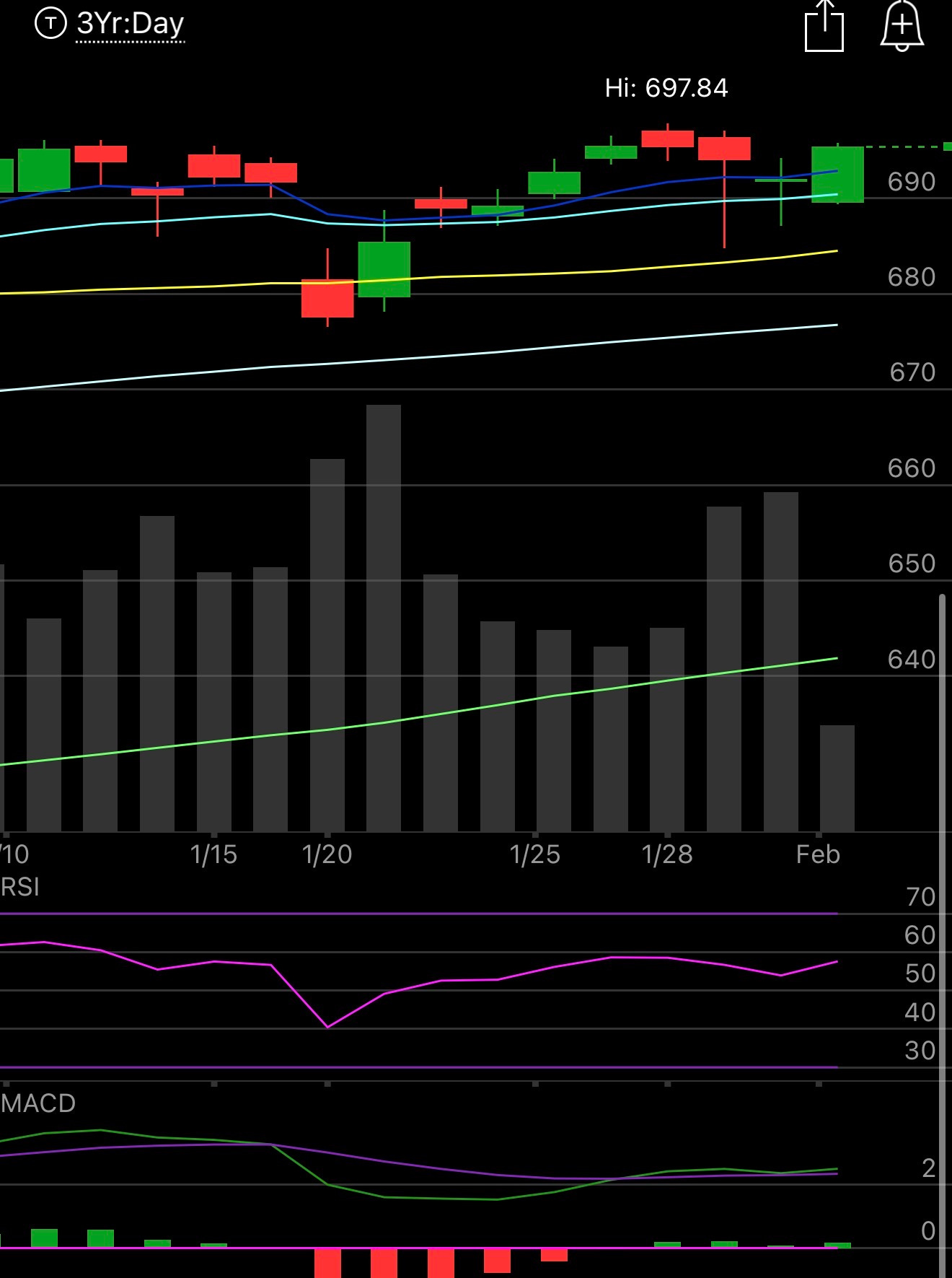 The SPY opened up below the 21 ema but has quickly rallied back over the 8 ema and for the moment looks good. I don’t want to be a bear but we’ve gone below the 21 ema 3 sessions in a row, that isn’t good, the more tests, the more likely the floodgates end up opening lower. Bulls would like to see this move up over 697.84 and make new highs. Earnings from Google and Amazon this week will be big catalysts for that. Otherwise alot of of the rate panic we saw with the Warsh nomination friday has subsided. I was thinking of taking some risk off on the open under the 21 but because we instantly recovered it I’m staying levered long until I see a meaningful move below and close.