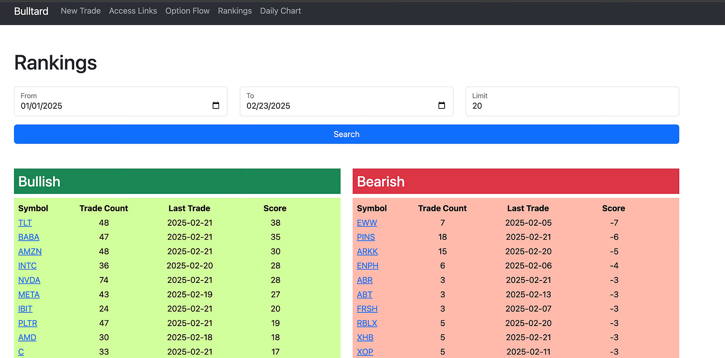 This week’s best idea is going to be different than usual, I usually pull up a name and go over the charts, option flow, and analyst targets, but with what I posted above, I’m going to discuss some potential trade ideas positioning for what I think is coming. I use the rankings tab in my database to look at the names seeing the most action and look at this top 10 list from January 1, 2025. You have a top 10 that includes BABA,INTC,PLTR,C, and META which have been 5 of the best performers this year. To nobody’s surprise, those names saw heavy bullish option flow before the move up.